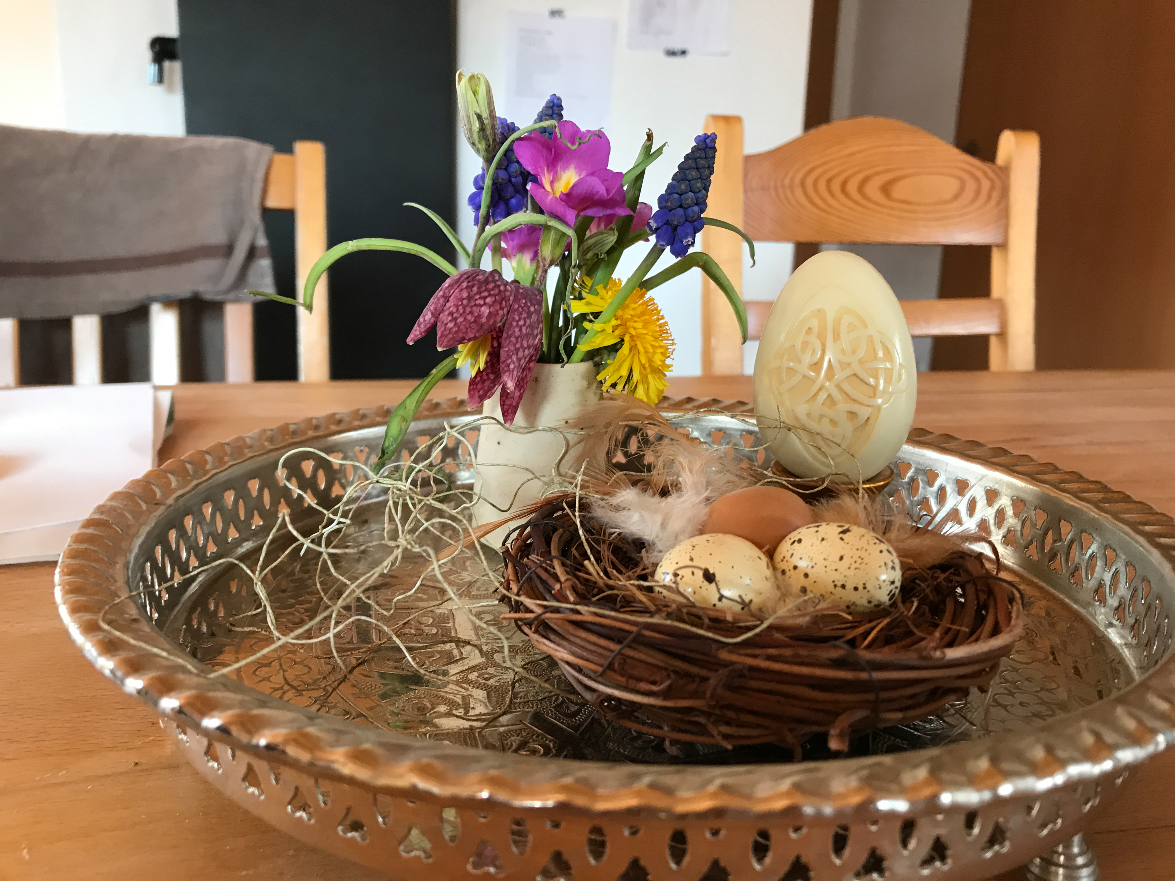 Ich hatte Lust, ein bisschen österlich zu dekorieren. Ich mag es gern, wenigstens ein paar Ecken des Hauses als Hingucker zu haben. In der Osterdekokiste habe ich mir ein paar Kleinigkeiten ausgesucht und zusammen mit frischen Blumen von draussen Tischschmuck zusammengestellt. Auch ein paar dekorative Fensterbilder waren noch in der Kiste.