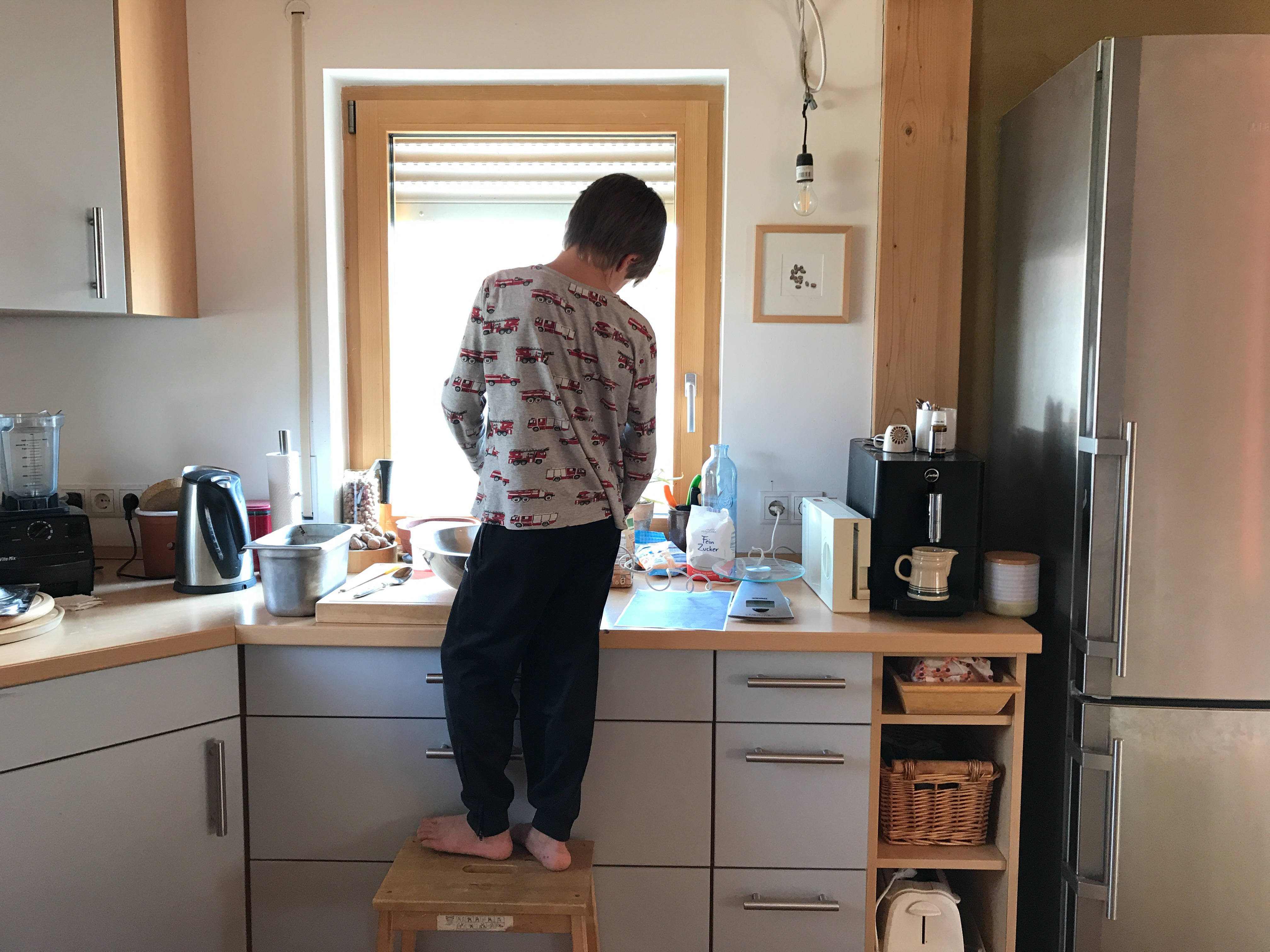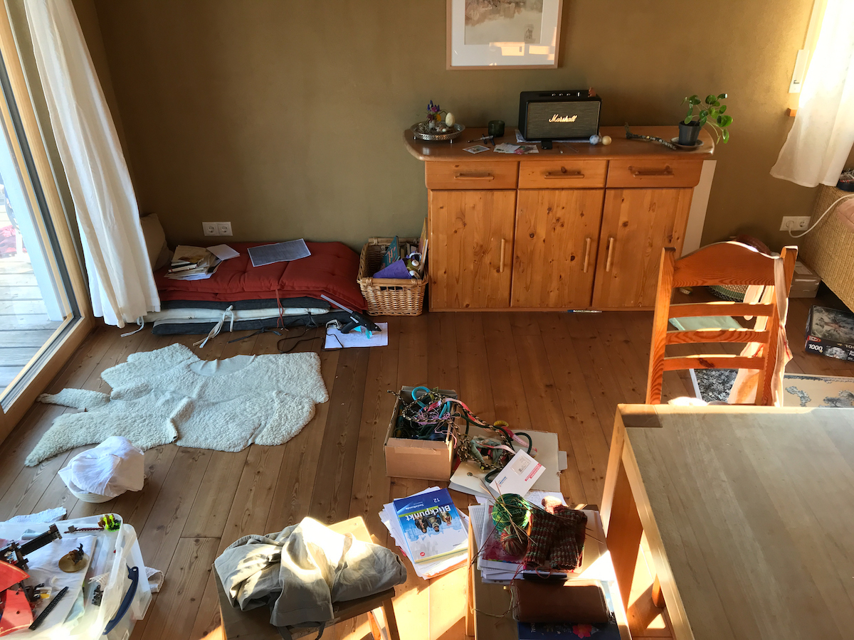 Da, links vor der Terrassentür steht der eingepackte Gärkorb. Das ist übrigens ein Einblick in unsere Wohnküche wie es derzeit oft aussieht. Das ist das Herz unseres Hauses. Hier halten sich alle am liebsten auf, auch wenn wir uns dabei manchmal auf die Nerven gehen. Aber irgendwie ist das der gemütlichste Raum: warm, gesellig und nah an Herd und Kühlschrank. Da liegt Lego am Boden und ein 1000er Puzzle, Schulaufgaben und Bastelsachen, Briefe, Bücher und Strickzeug: Kunterbuntes Familienleben.