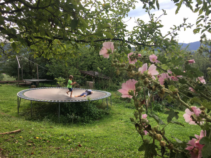 Genau das ist es, was mir so gut gefällt: keine Termine, keine Verabredungen, keine Menschen. Einfach nur Ruhe und in den Tag hineinleben. Manchmal teilen wir uns auf und verbringen Zeit allein oder in kleinen Grüppchen. Manchmal hängen wir alle zusammen rum und gehen unseren Dingen nach. Die Kinder werden kreativ und spielen aus Mangel an Spielsachen mit gefalteten Papierbooten und Schnüren, die von meinen Häkelprojekten übrig sind. Oder sie springen Trampolin.