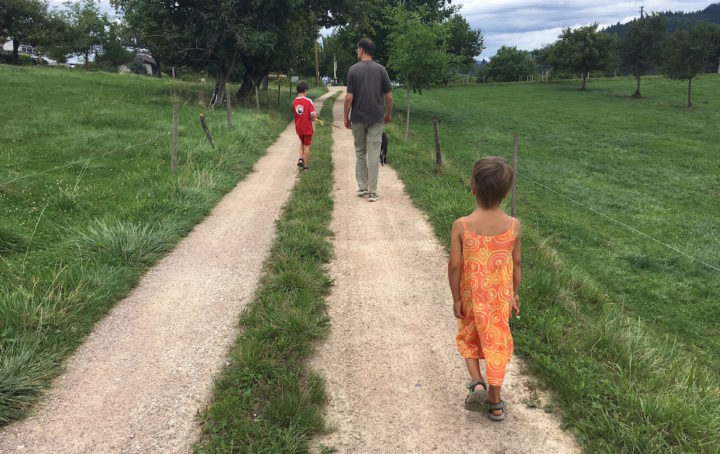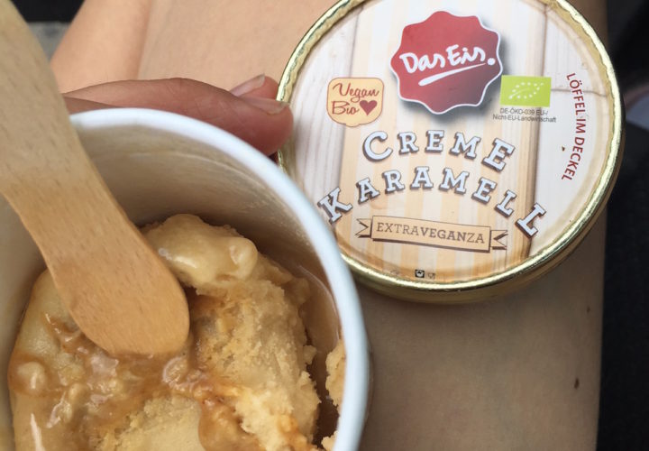 Zurück daheim hüpfen die Jungs Trampolin. Ich seile mich ab und fahre nochmal nach Freiburg, um im Alnatura die vergessenen Tofuwürschtel fürs Abendessen und ein kleines Gastgeschenk zu kaufen. Ausserdem gönne ich mir ein Eis und kaufe Haarspangen für meine immer länger werdenden Haare.