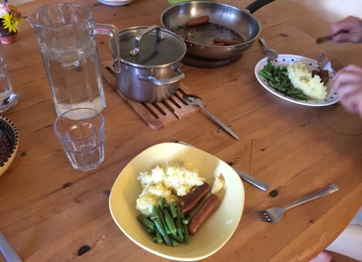 Gegen 17 Uhr bereiten wir das Abendessen vor. Insipiriert von Instagram hatte ich Lust auf Kartoffelbrei, grüne Bohnen und Würstchen. Das war tatsächlich lecker. Wir räumen die Küche auf, die Jungs springen dann noch eine Runde Trampolin und spielen. Dann bringt der Mann den Sterngucker ins Bett. Ich ernte derweil im Garten die herangereiften Tomaten und eine Schüssel Brombeeren. Auch die Zwetschgen werden langsam reif und leuchten in ihrem Blaulila an den Ästen.