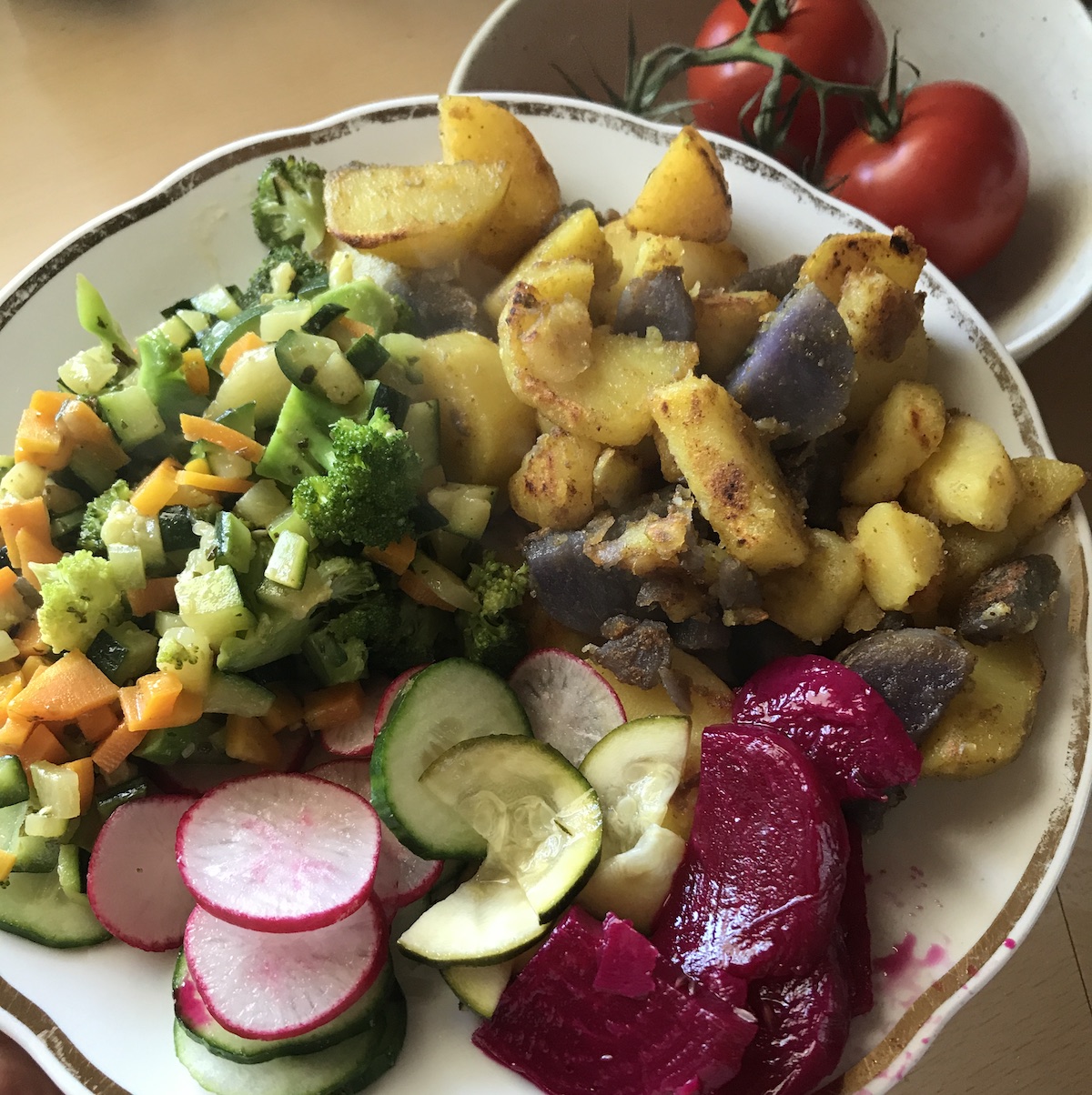 Ich habe ein bisschen an einem Flyer gearbeitet und an einer Auftragsarbeit für einen Trauspruch. Zum Mittag gab es leckeres buntes Essen mit Sommergemüse und Kartoffeln. Ich nutze die Zeit zum Hörbuch hören (Extraordinary Leadership von Robin Sharma) und schaue mir Onlinekurse an, die ich gebucht hatte, aber noch nicht zu Ende geschaut. Am Sonntag war ich so begeistert von den neu gelernten Buchstaben, dass ich aus meinen Übungsblättern Briefköpfe für noch zu schreibende Briefe machte.