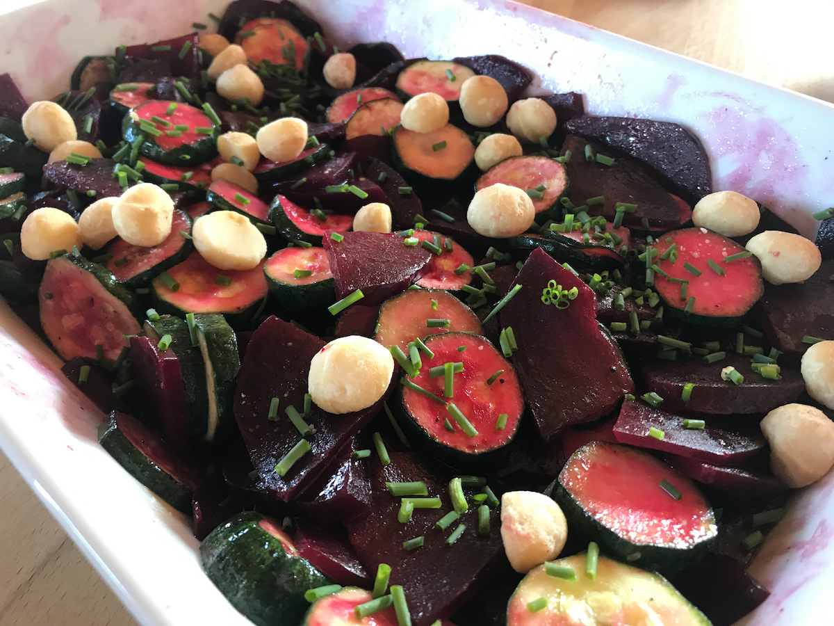 Die Tochter geht oft mit dem Leihhund spazieren, knüpft Hundeleinen und Halsbänder (falls du einen Hund hast und Interesse an einer individuell gefertigten Leine/Halsband, vermittle ich gern den Kontakt) und kümmert sich bisschen um ihren Schulkram. Der Sterngucker hat den Rasen gemäht und hat mich bei meiner Laufrunde begleitet. Der Wolf schlurft sich durch den Tag und hat in letzter Zeit besonders Freude am Essen bereiten. Nur nicht, wenn er Hunger hat. Wir haben in der letzten Woche wirklich gut gegessen. Ich bin ganz glücklich über unseren Speiseplan, der richtig gut funktioniert hat. Heute abend gab es Pizza. Am Wochenende essen wir die Reste – lauter übriggebliebene Kleinigkeiten der Woche, wie zum Beispiel der Rote Beete Salat mit Macadamia Nüssen.