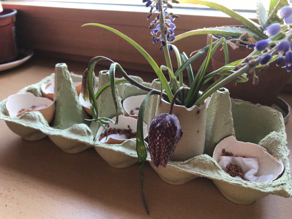 Heute hat der Lehrer vom Sterngucker angerufen und nachgefragt, wie es uns geht. Das war schön, kurz im Gespräch zu sein. Im Blog habe ich die Anleitung für Frühlingsdeko im Glas wieder rausgesucht. Vielleicht hast du ja ein bisschen Bastellust. Ich freue mich gerade über meine Schachbrettblumen, die zu blühen beginnen. Leider sind einige davon abgeknickt oder angeknabbert (Wühlmäuse?). Mal sehen, ob sie in der Vase weiterblühen. In leere Eierschalen habe ich Kresse gesät. Überhaupt ist mir das Säen und Pflanzen und beim wachsen Zuschauen ein großer Anker.