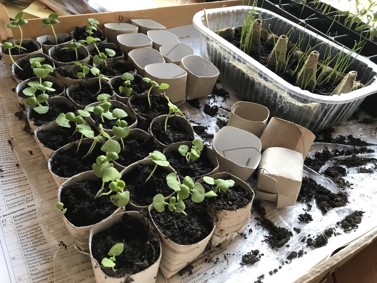 Ausserdem habe ich einen Kundenauftrag fertiggestellt, mich um Wäsche und Wochenplanung gekümmert. Die Tochter hat Milchbrötchen gebacken, die Jungs haben gezockt. Meine ausgesäten Pflänzchen haben nun eine schöne Größe erreicht, dass ich sie vereinzeln könnte. Ich habe keine Anzuchttöpfchen, also habe ich mir während die Sendung mit der Maus lief aus leeren Klopapierrollen kleine Töpfchen gebastelt (use what you have). Dort kommen jetzt Basiilikum, Koriander und Lauch hinein, um kräftig weiterzuwachsen bis ich sie nach draussen pflanzen kann. Oh, dieses Jahr bin ich so begeistert von den Gartenvorarbeiten (vermutlich bis zu dem Moment, wo die Schnecken mir alles niederfressen).