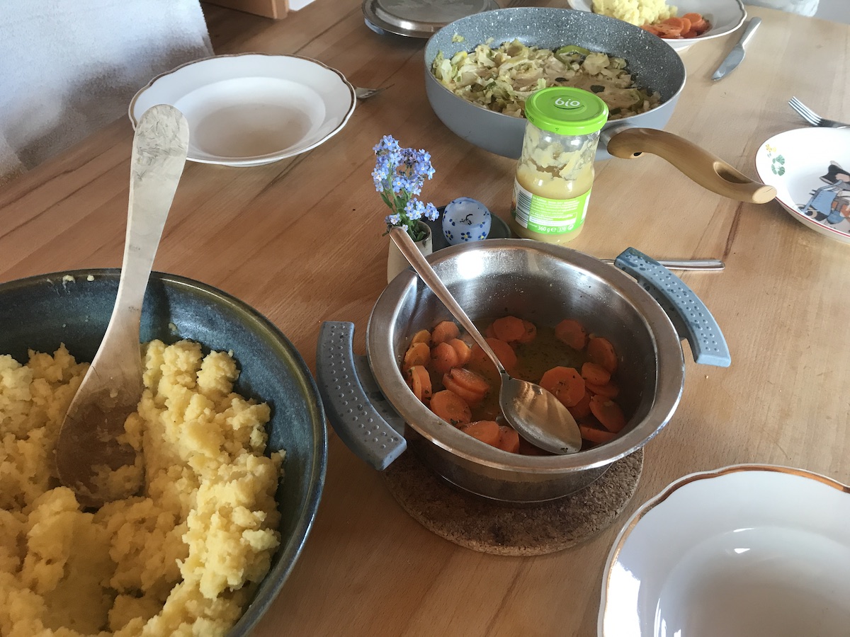 | Montag | Kartoffelbrei mit wahlweise Karottengemüse oder Spitzkohl in Sahnesosse | Kräuterbaguette, Antipasti und Salat |