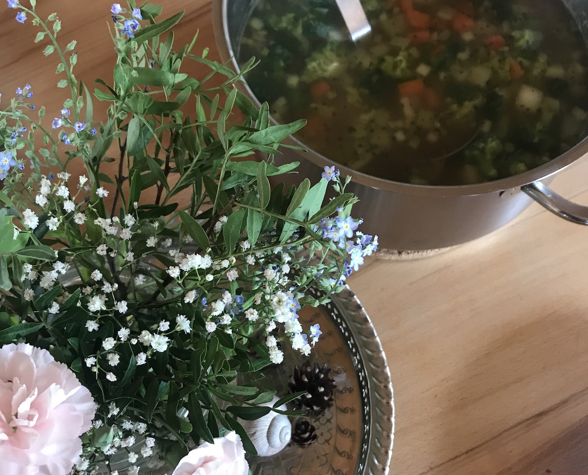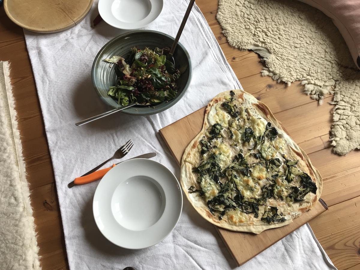 Leckere Mittagessen mit dem Mann nach unserem Speiseplan. Es gab schon Burger (mit Bratlingen nach diesem Ringelmiez-Rezept, aber statt Petersilie habe ich Giersch aus dem Garten genommen), Gemüsesuppe und Mangold-Flammkuchen (spontan als Picknick auf dem Büroboden, weil die Putzfrau die Küche gewischt hat). Ausserdem hatte ich, entweder allein oder mit dem Mann, wieder Zeit für Spaziergänge. Das tut so gut! Und: Reparierte Socken aus dem Handarbeitskorb. Sowas schiebe ich gern vor mir her. Wenn es dann doch fertig wird, freue ich mich immer.