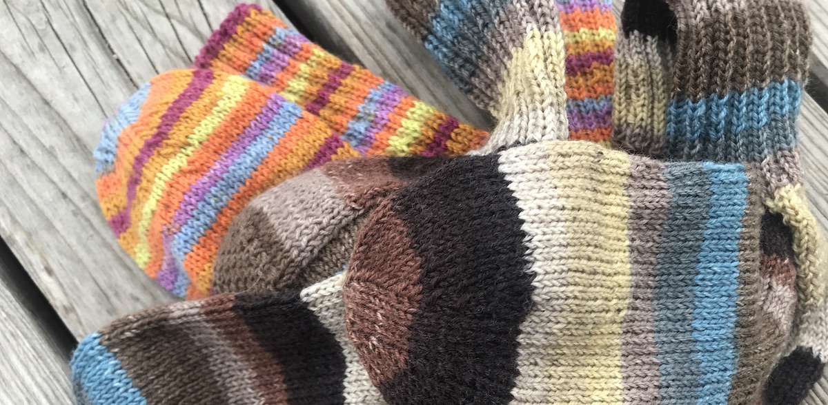 - Im Projektbeutel warten neue (Regenbogen)Socken darauf, dass ich sie anschlage.