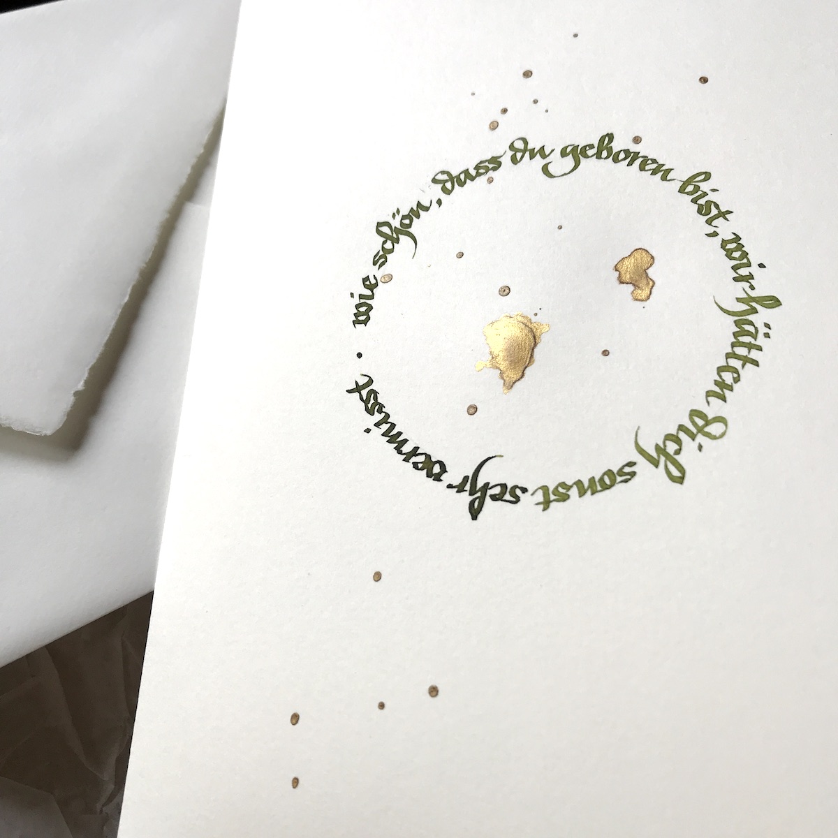 Bis dahin stehen aber noch ein paar schöne Dinge im Kalender. Ein Frauenverwöhnfrühstück in der Gemeinde, der Wolfsche Kindergeburtstag, und ein Schwimmbadbesuch mit dem Wolf. Heute habe ich endlich mal wieder einen Beitrag für den Kallimagie-Blog geschrieben. Dort zeige ich, wie du Kalligrafie im Kreis schreiben und eine schöne Geburtstagskarte gestalten kannst.