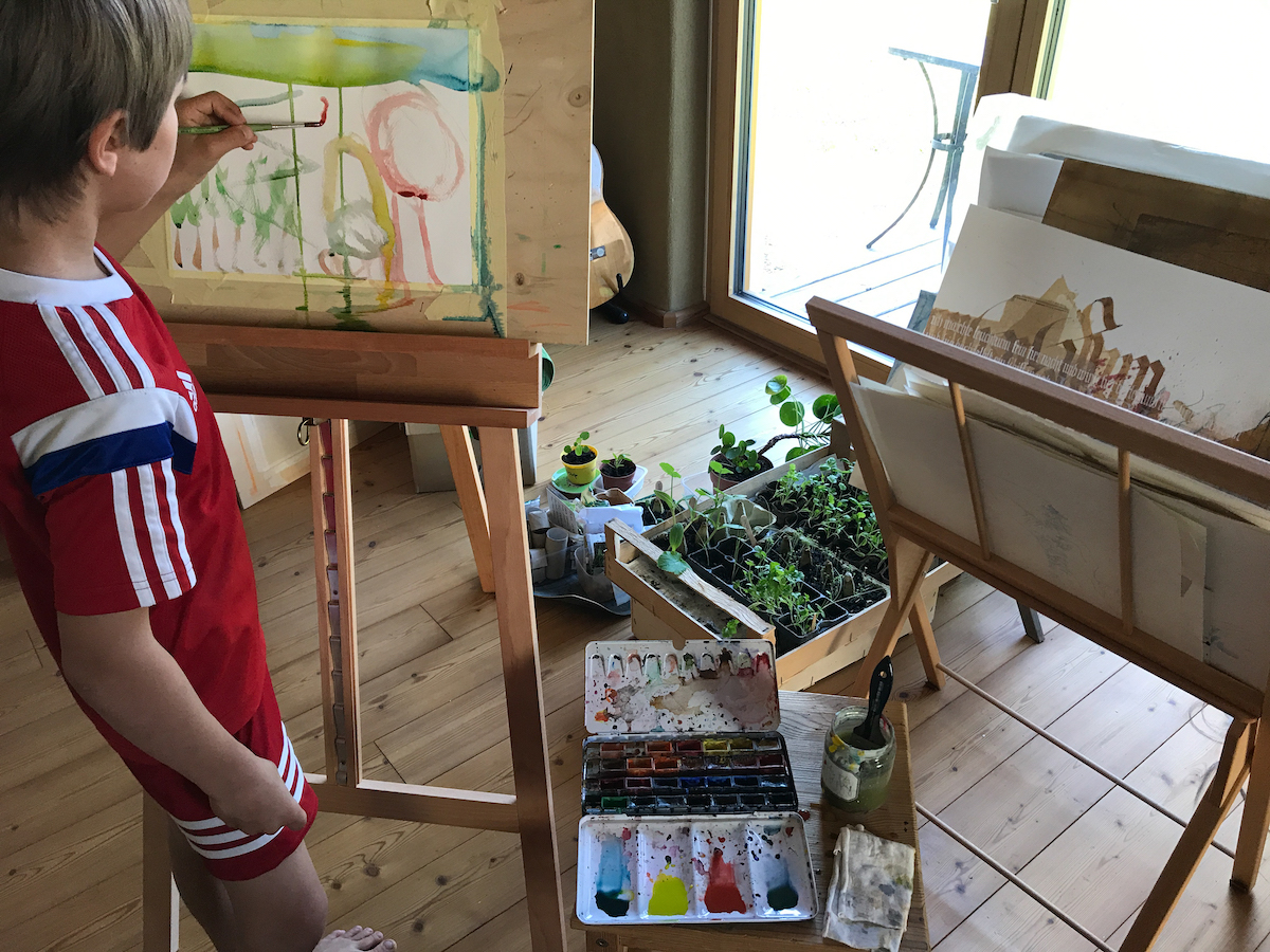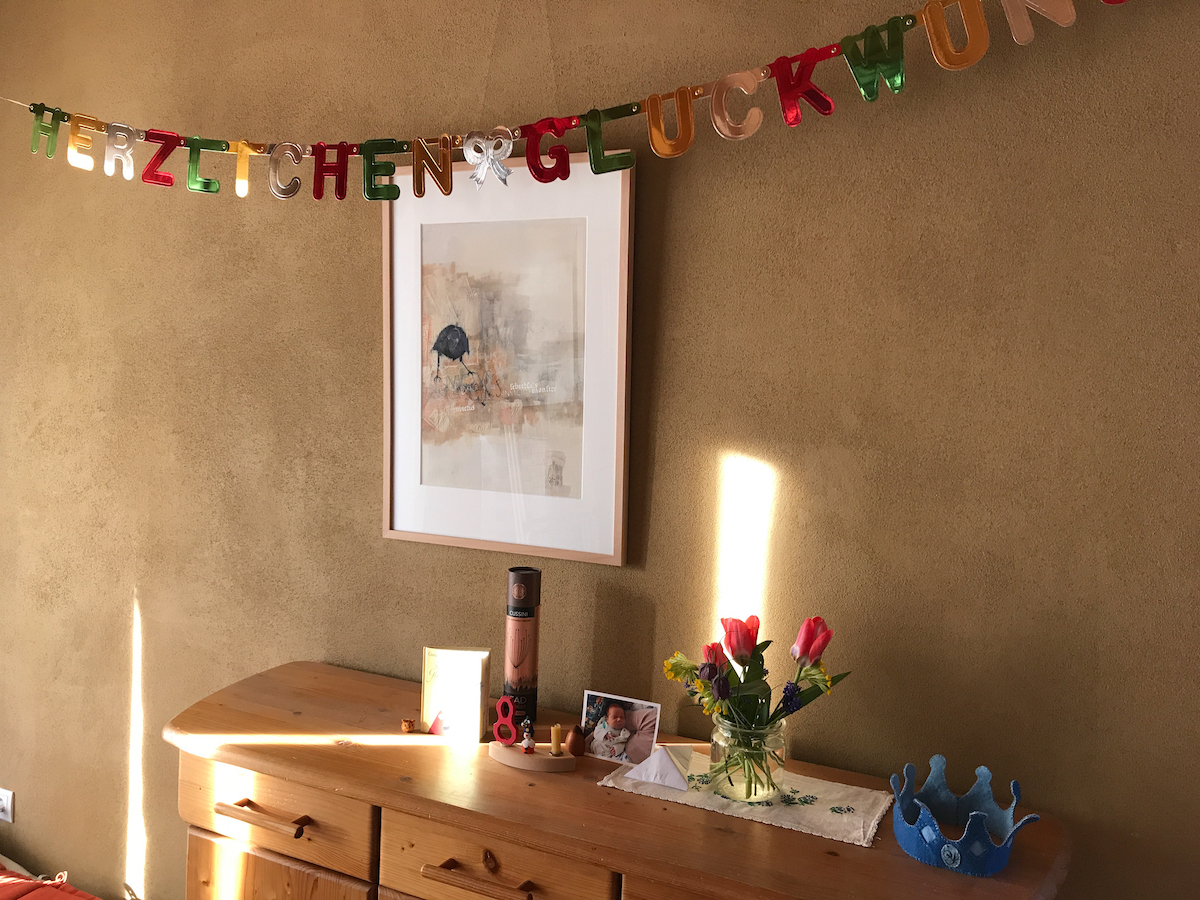 Der große Bruder hingegen tat sich etwas schwer mit der Geburtstagsaufmerksamkeit, die dem Sterngucker zuteil wurde. Er brauchte zwischendrin immer etwas extra Kontakt. Wir haben zusammen Musik gemacht, heute seine Haare gewaschen und mit der Schwester war er mit dem Hund spazieren. Am Abend geniesst er einen Filmabend ganz allein mit dem Mann. Das ist so deren gemeinsame Zeit. Ich mag das Ritual gern. Die beiden haben ihren Filmabend, ich ziehe mich dann meist ins Büro zurück zum Schreiben oder Malen oder ins Bett zum Lesen.