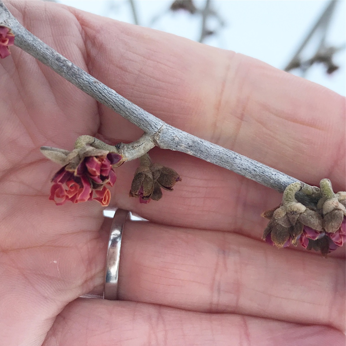 Heute, als ich gegen 17 Uhr nach draussen spazieren gegangen bin, habe ich mich sehr gefreut, dass es noch hell war. Überhaupt liegt schon so viel Frühling in der Luft, auch unter dem Schnee. Diese Verlässlichkeit auf die Natur, dieses Hoffnungsvolle und Wiederkehrende. Meine Hamamelis blüht! So lange habe ich darauf gewartet und die Knospen beobachtet. Jetzt rollen sich die roten Feuerzungen aus ihren Hüllen.