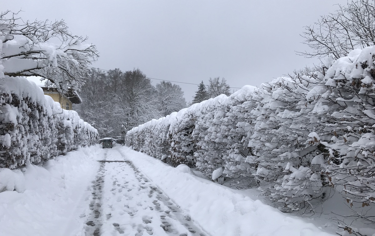 Es hat die ganze Nacht über geschneit. Die Tochter stapfte also wadentief durch den Schnee zur Bushaltestelle, in der Hoffnung, dass der Bus nicht kommt und sie nicht zur Schule muss. Die Wolfschule hat schulfrei, von der Tochterschule hatten wir eine solche Nachricht nicht. Der Plan ging nicht auf, weil ein netter Nachbar die Tochter stehen sah und mit dem Auto zum Bahnhof mitgenommen hat.