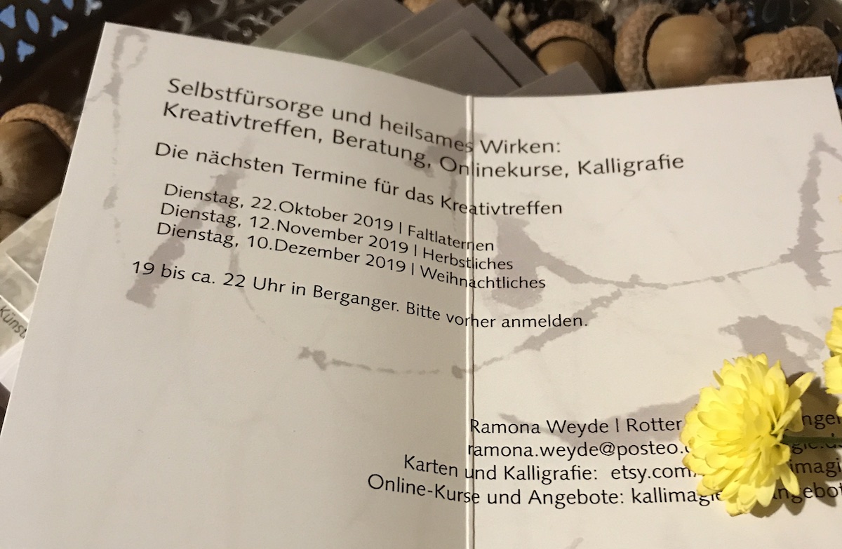 Gestern kamen meine Kärtchen zum Auslegen beim Tut-Gut-Festival. Dort habe ich meine Kontaktdaten und die Termine der nächsten Kreativtreffen aufgeschrieben. Ich freue mich immer, wenn ich Post von der Druckerei bekomme und die Sachen auch noch gut aussehen. Überhaupt sind wir sehr beim Vorbereiten für unseren part beim Tut-Gut-Festival. Wer wird wann am Stand sein, was brauche ich für meinen Workshop, wo sind die Kinder währenddessen, was fehlt uns noch? – all solche Fragen beschäftigen uns.