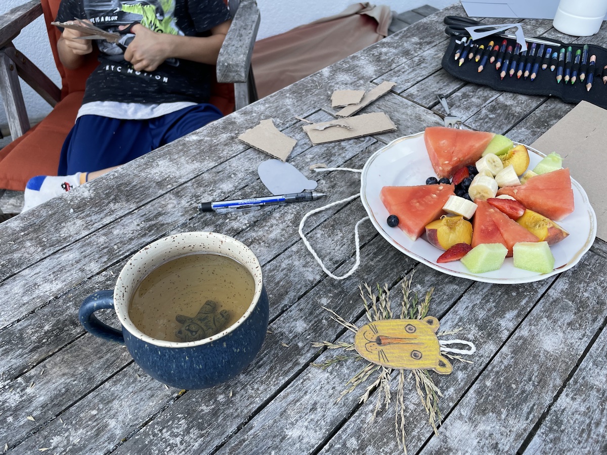 Heute starte ich in ein sehr buntes und volles Wochenende. Ich habe gerade Brezen gekauft, die der Mann nachher, wenn ich im Coaching bin, mit Butter beschmieren wird. Gerade nimmt er noch seinen Podcast auf. Die Butterbrezen nehme ich heut Mittag mit zur Schule und gebe sie in der Küche ab für heut Nachmittag zum Kennenlerntreffen der neuen Schuleltern und -kinder. Diese Tätigkeiten (Essensspenden, Dienste) sind Elternarbeitszeit, die wir an der Schule leisten als Teil der Schulgemeinschaft. Heute Nachmittag habe ich meine letzte Pausenaufsicht und Nachmittagskurs vor den Ferien an der Schule. Ich habe überlegt, mit den Kindern kleine Graslöwen zu basteln. Mal sehen, ob sie Lust haben. meistens fällt ihnen nämlich ganz was anderes ein. Die Bastelei habe ich gestern mit meinen Jungs schonmal testgebastelt.