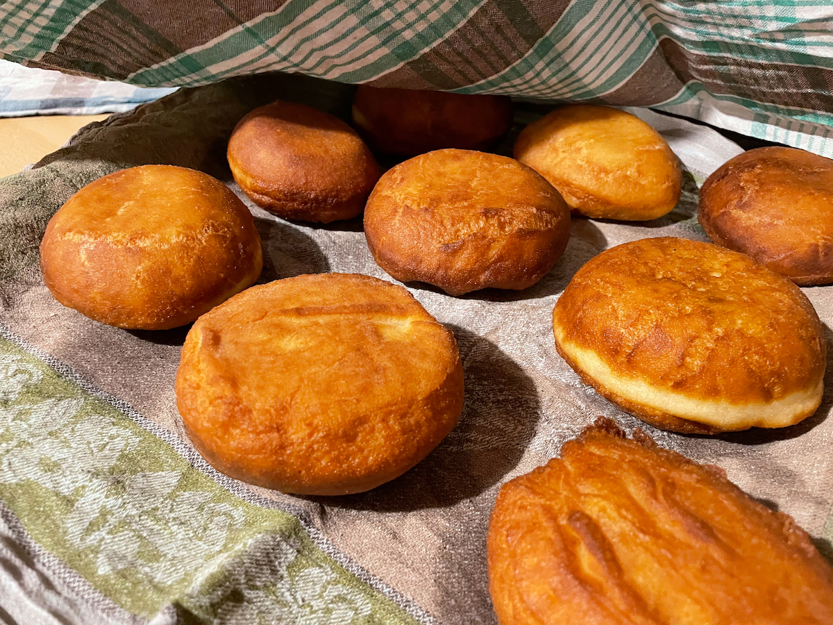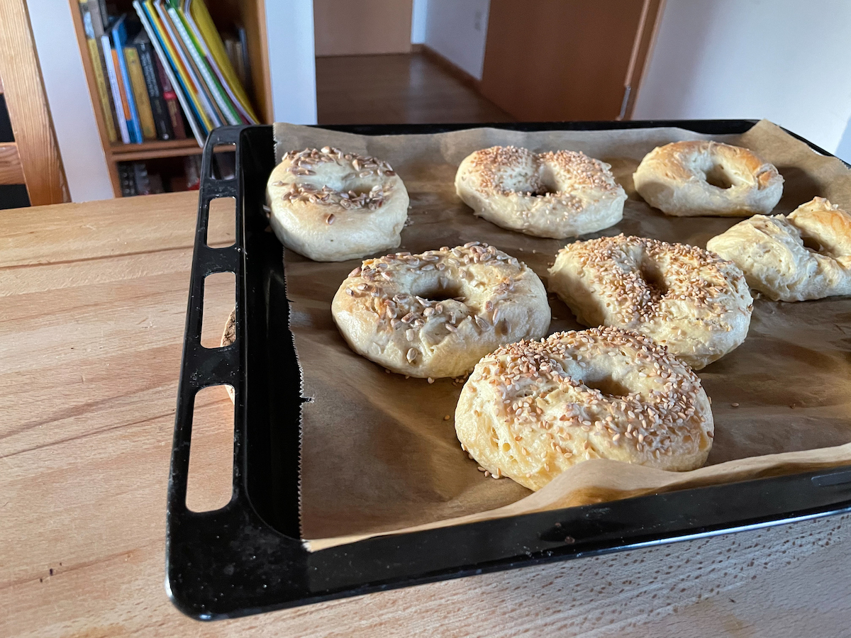 Mit dem Wolf übe ich eine Runde Mathe. Ein paar wenige Aufgaben Multiplikation mit Dezimalbrüchen. Der Wolf ist schneller und besser als ich. Ich tue mich schwer mit Kopfrechnen. Die Tochter setzt sich zu uns und macht ihre eigenen Mathe-Aufgaben. Abitur. Andere Liga. Ich kann damit nichts mehr anfangen, obwohl ich früher Mathe-Leistungskurs hatte. Dann spielen wir nochmal eine Runde Skibbl. Die Tochter bäckt Bagel und versucht sich an Krapfen.