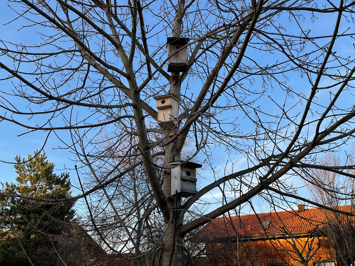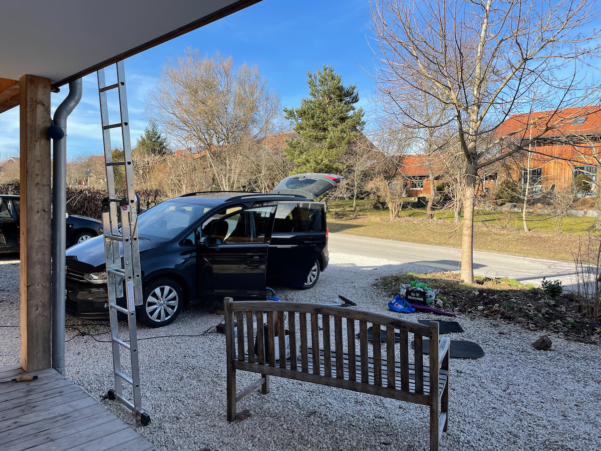 Nach dem Mittag verbringen wir Zeit im Garten und ums Haus: Auto waschen, Laub harken, Nistkästen saubermachen und aufhängen. Zum Tee gibt es Krapfen von der Tochter.