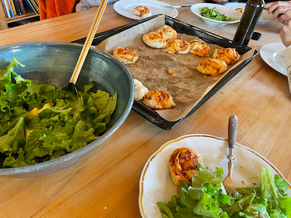 • Pizzaschnecken mit Salat (und dem Dressing von Oma. Den Zucker ersetzen wir durch Agavendicksaft)