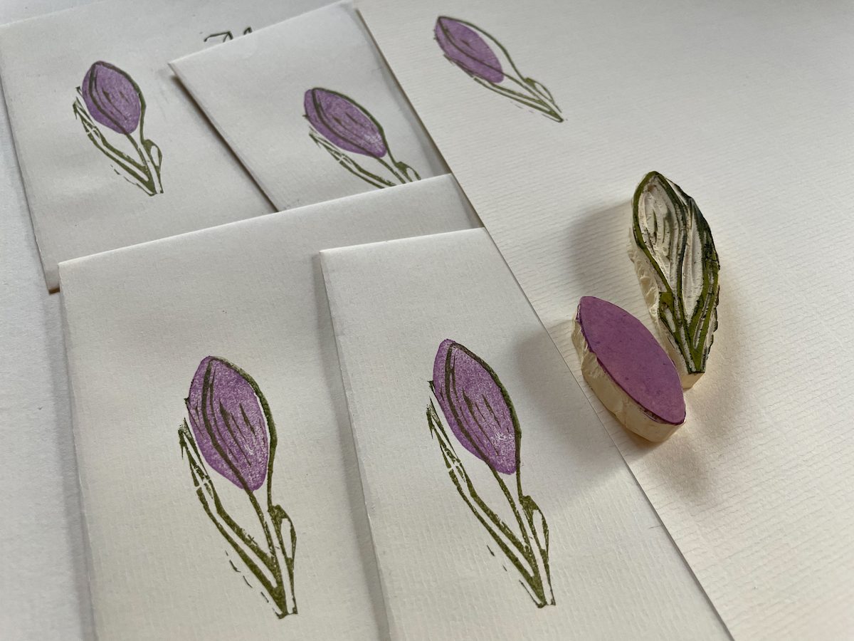 • Ich bereite Briefe vor, die ich mit einem Krokus-Stempel, den ich vor ein paar Jahren mal geschnitzt habe, verziere.