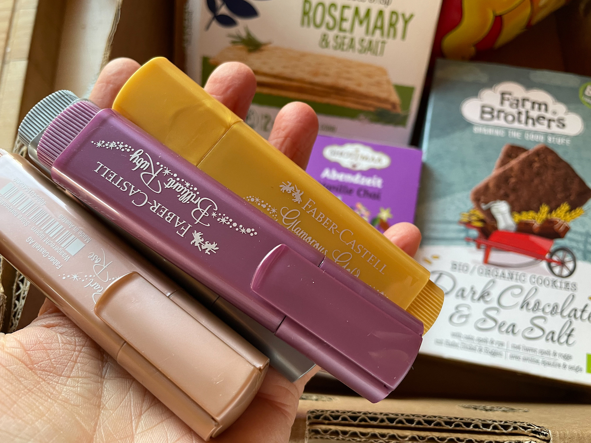 Zeit zum Trompete spielen, ich freue mich über eine überraschende Telefonverabredung, leckeres Curry zum Mittag, mein Einkaufsbummel im Bioladen, neue Stifte mit Glitzer, der wunderbare Zoomabend mit den Schriftenteppich-Kurs-Teilnehmerinnen, Leckerein aus dem Bioladen