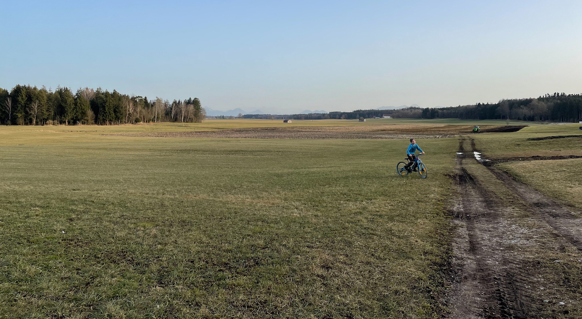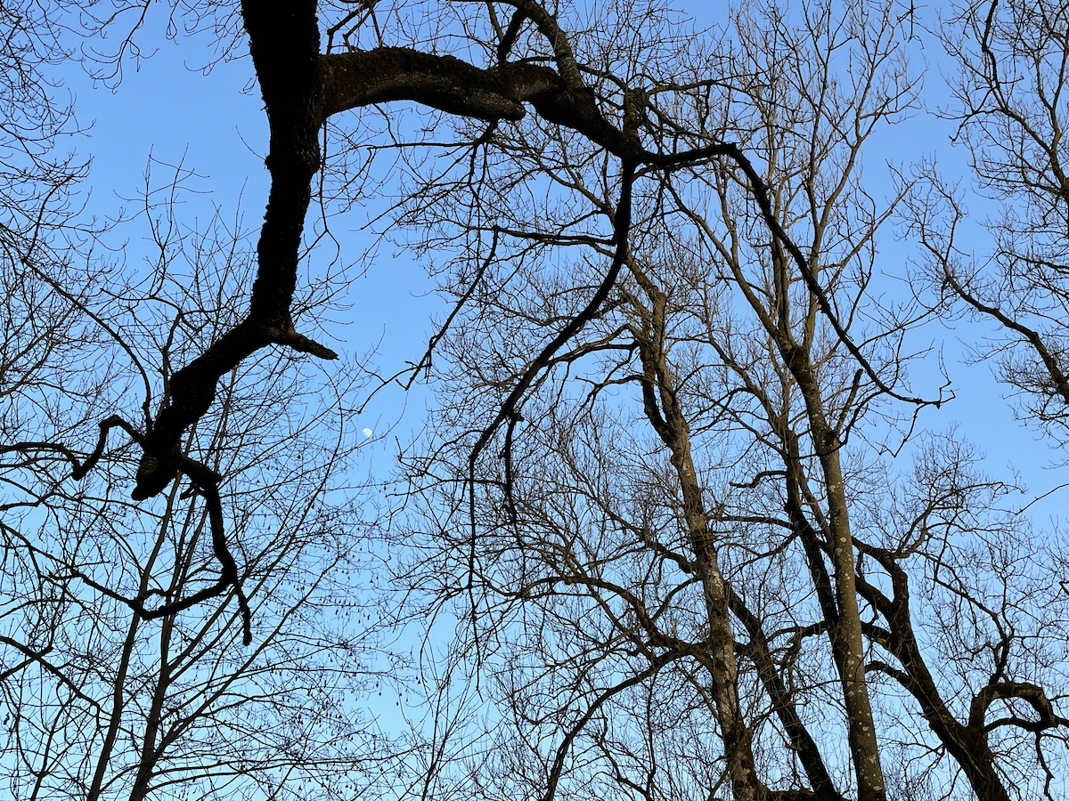 Wieder daheim esse ich ein paar der mitgebrachten Leckerein, trinke Tee und mache einen Spaziergang. Da der Sterngucker unsere Strecken kennt, fährt er mir mit dem Radl nach. Kleiner Kamikazi. Ich freue mich über das Licht, das wilde Vogelgezwitscher und die milden Temperaturen. Am Himmel steht der Mond. Es ist ein unruhiger Spaziergang.