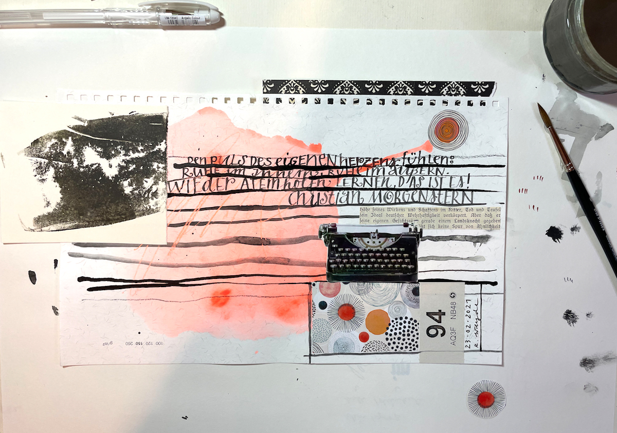 Am Abend zeichne ich das Portrait ins Moleskine und habe einen tollen Zoomcall mit meinen Kursteilnehmerinnen im Schriftenteppiche Kurs. Heute geht es experimentell zu, was echt Spaß macht. Im Tun versinken, kleben, schreiben, gestalten. Schade, dass es schon der letzte Zoomabend gemeinsam war.