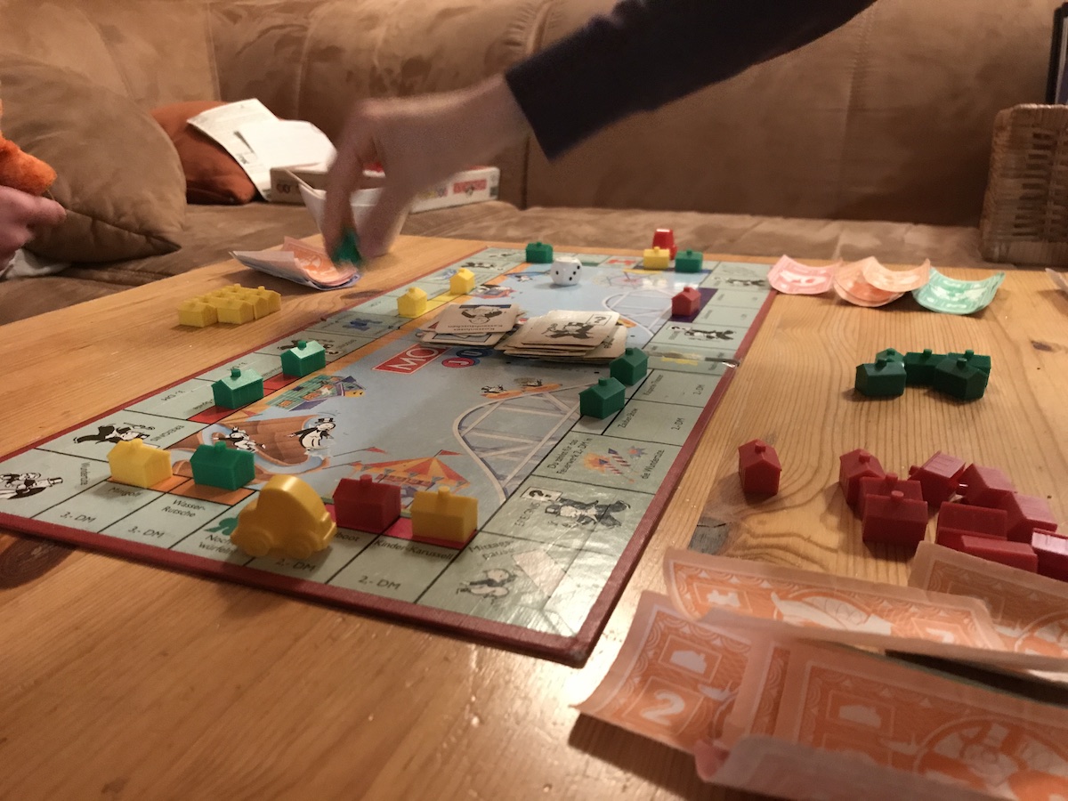 Wir haben vor, uns ein gemütliches und faules Wochenende zu machen. Ich habe Malzbier und Chips gekauft. Heut Abend haben wir direkt mit zwei Runden Monopoly Junior zu dritt gespielt. Das Spiel haben wir gerade aus der Bibliothek ausgeliehen.
