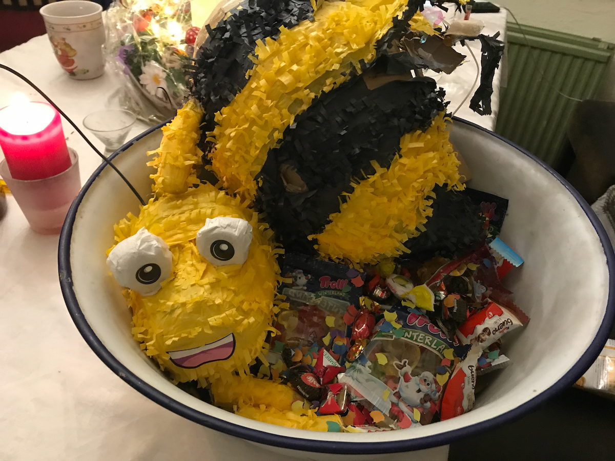 Ich hatte Zeit für Spaziergänge mit meiner Oma oder der Tochter. Wir haben Faschingsgirlanden aus alten Katalogseiten gebastelt und den 18. Geburtstag meiner Tochter (und 65.Geburtstag meiner Mama) gefeiert. Sie hatte sich eine Pinata gewünscht, die sie von meiner Schwägerin bekommen hat. Damit hatte sie viel Spaß. Nun wollen die Jungs auch zu ihrem Geburtstag Pinatas.