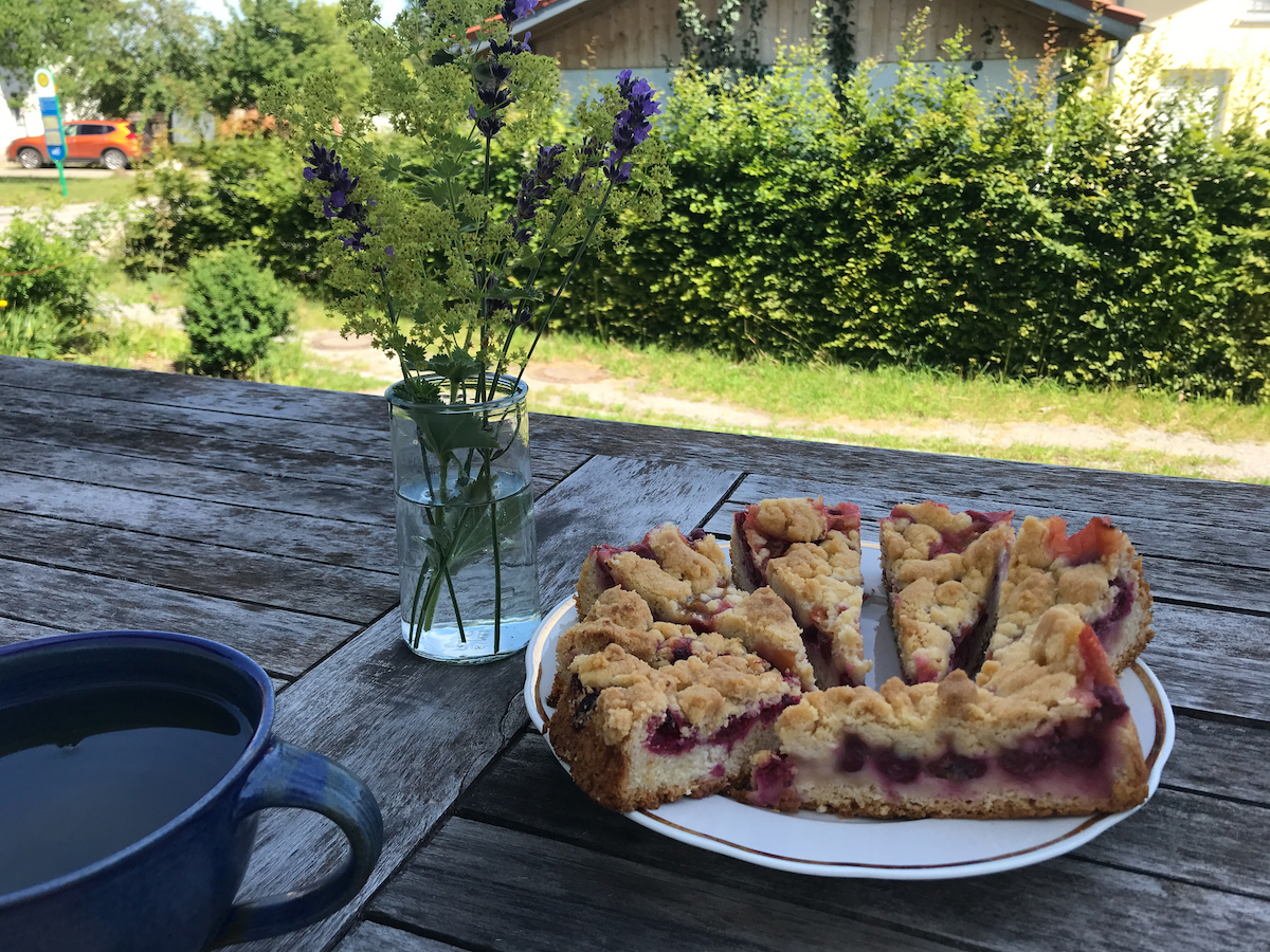Von den Stachelbeeren hatte meine Mutter leckeren Kuchen gebacken. Das Rezept hab ich mir notiert und will es am Wochenende selbst probieren. Der war nämlich unerwartet gut (ich habe ein ambivalentes Verhältnis zu Stachelbeeren). Nach und nach reifen nun auch die Himbeeren. Die ersten hab ich schon direkt genascht. Auch die Brombeeren versprechen eine üppige Ernte, so dicht wie sie schon behangen sind.