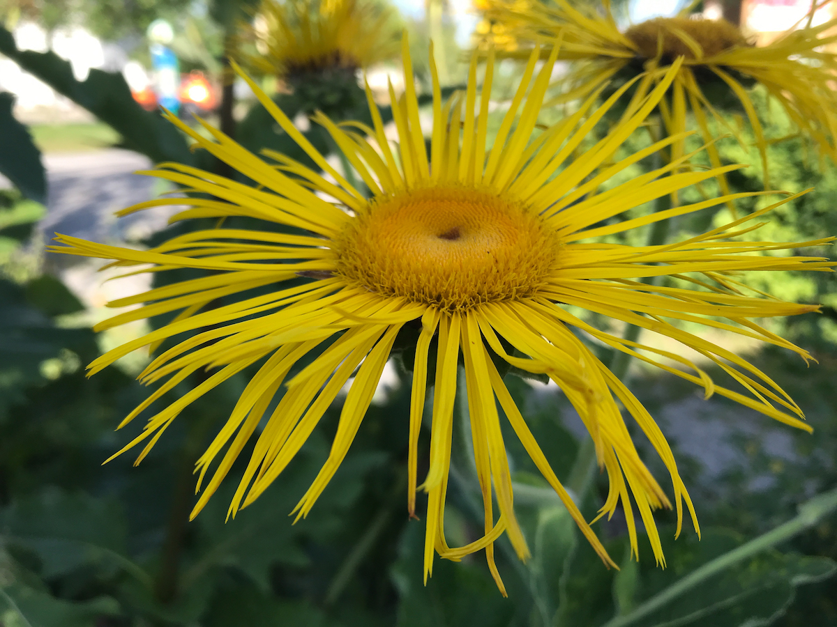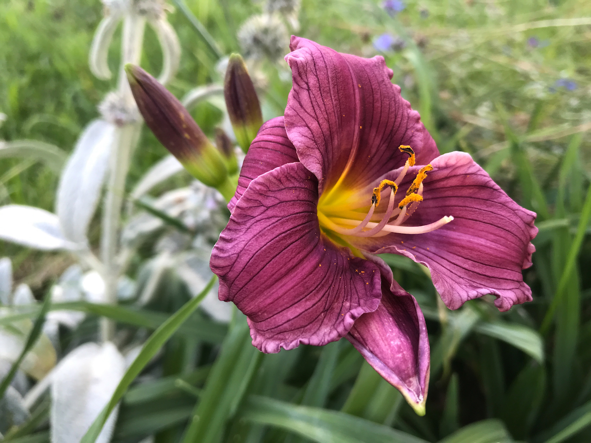 Vor dem Haus blühen Alant, Federmohn, Lilien und andere Blüten. Im Kräuterbeet und im Lavendel ist ein reges Gesumme und geflattere. Das freut mich immer, so viele Bienen und auch Schmetterlinge in unserem Garten zu sehen.