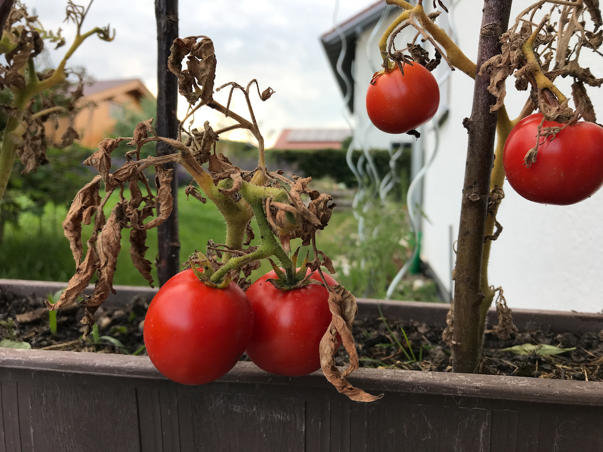 Die Tomaten sind bisher von Braunfäule verschont geblieben. ich glaube, der andere Standort (unter dem Dachvorsprung) und das Regenwasser aus der Regenwassertonne tun ihnen gut. Die Tomaten in den Töpfen sind besser geworden als die im Kasten. Da ist mir das Kraut etwad verdörrt, wie man sieht.