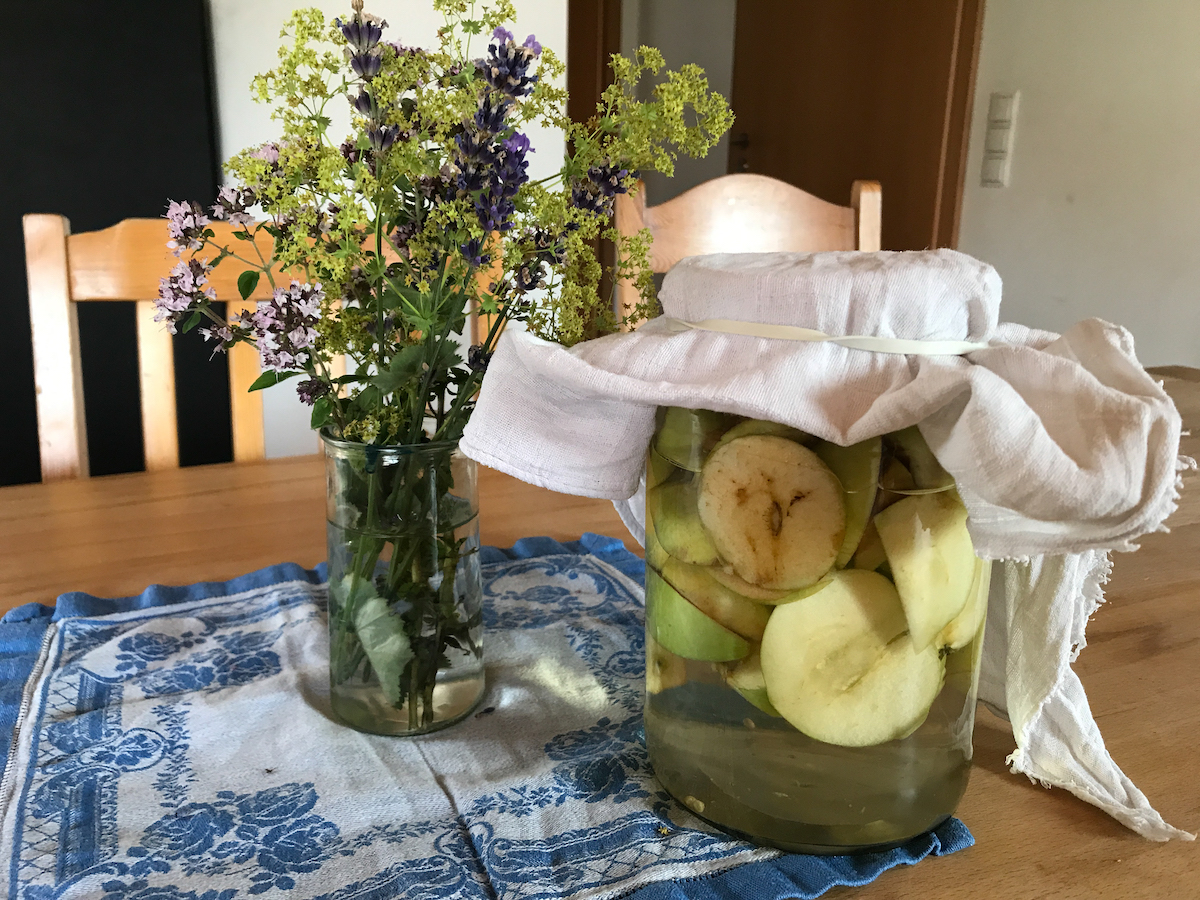 Gestern habe ich eine Freundin besucht und in ihrem Garten von den Klaräpfeln welche mitgenommen. Von denen versuche ich jetzt Apfelessig zu machen. Das habe ich bei Sabrina auf Instagram entdeckt. Es klingt so einfach. Ich bin gespannt. Zum Mittag hatten wir Spaghetti mit Giersch-Pesto. Überhaupt haben wir viel über Wildkräuter gesprochen und wie toll es doch ist, dass die voller Nährstoffe direkt vor der Haustür wachsen und nichts kosten.