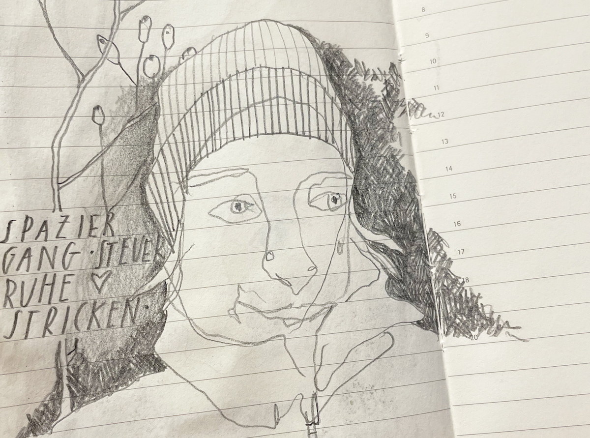 Ich habe ein neues Moleskine gestartet, mein kleines Skizzenbuch für alle Tage. Als Langzeit-Projekt habe ich mir das Thema Selbstportrait ausgesucht. Austin Kleon hat ein 100 Tage Projekt blindgezeichneter Selbstportraits gemacht, das fand ich inspirierend. Mal sehen, wie es sich entwickelt. Die Portraits brauchen nicht viel Zeit, sind unkompliziert und anspruchslos. Ich kann sie gut mit Tagesthematiken kombinieren oder einfach nur Linien da stehen lassen. Bisher habe ich wirklich Spaß daran. Und wer weiss, vielleicht gehe ich ja mal tatsächlich zu konkreteren Portraits über, wenn ich der lockeren Zeichnungen überdrüssig bin.