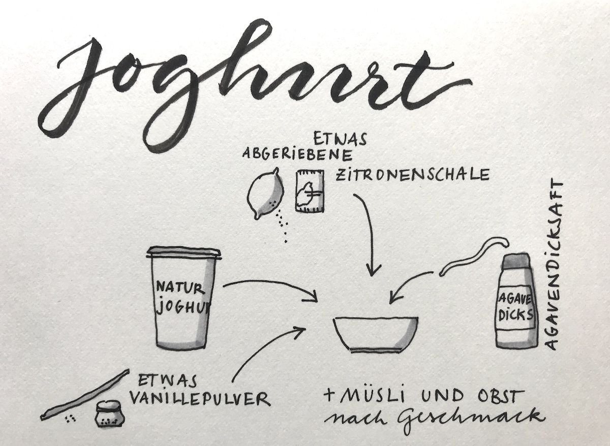 Anbei habe ich noch ein schnelles Rezept für dich. Die Kinder mögen diesen gepimpten Naturjoghurt gerade wieder gern. Den gebe ich als Brotzeit mit etwas Müsli mit, als Snack daheim oder zum Frühstück. Das geht ganz einfach:
