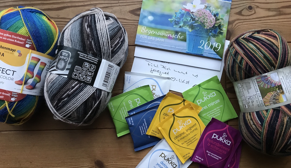 Die Post brachte mir ein tolles Tauschpackerl. Ich hatte bunte Restewollsocken gegen neue Wolle getauscht. Dazu kamen noch Pukka-Tees und ein Kalender. Ich bekomme so gern Post.
