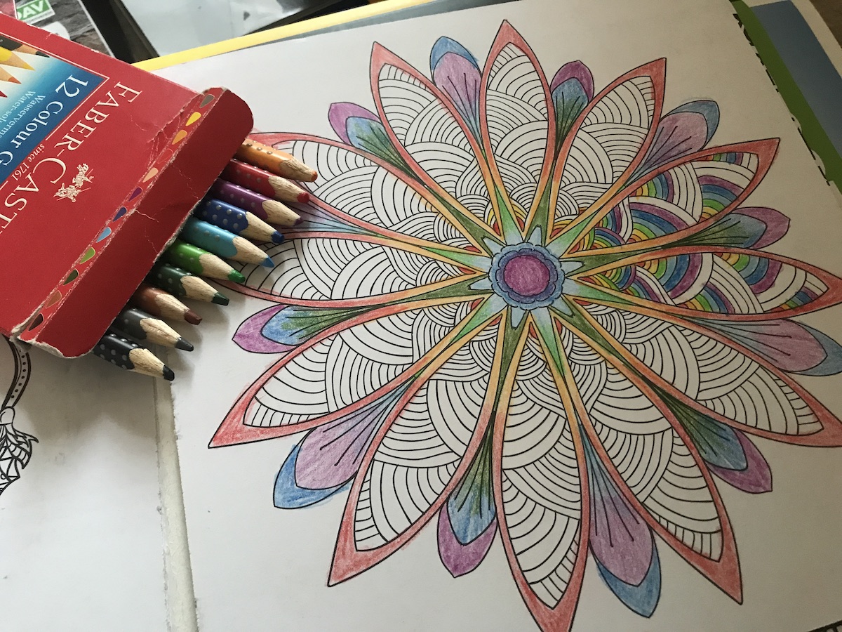 Bis zu meinem nächsten Termin habe ich noch ungefähr eine Stunde Zeit. Ich rufe eine Freundin an, mit der ich schon lange nicht gesprochen habe, und wir ratschen bis ich los muss. Heute habe ich nämlich wieder ein Date mit meinem Osteopathen. Im Wartezimmer male ich an meinem Mandala weiter. Da liegt ein Ausmalheft und Stifte. Jedesmal, wenn ich warte, male ich ein Stück weiter.