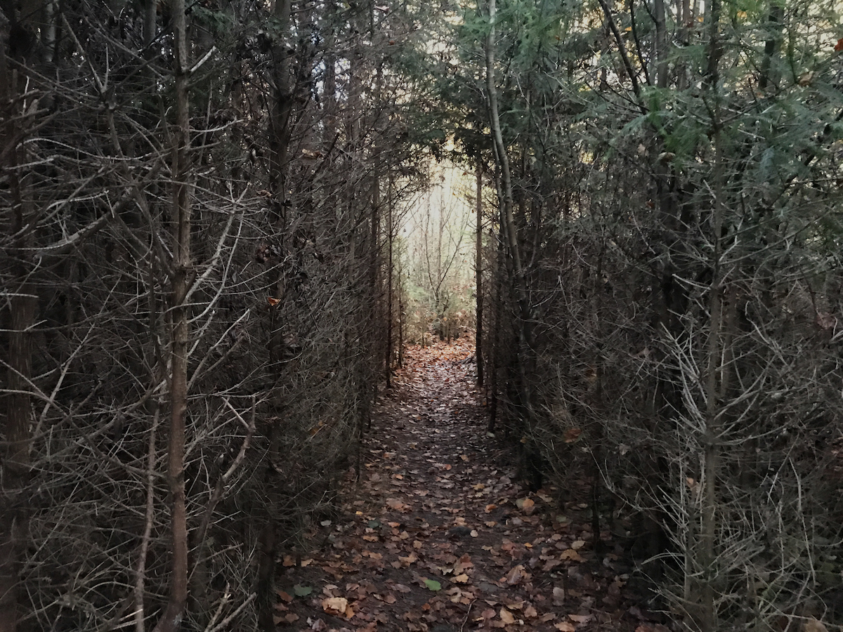 Ich sauge das letzte Leuchten auf. Die herrlichen Herbsttöne des Oktobers. Die Wärme und die Hoffnung. Ich tanke Alleinzeit, komme aber auch beim Spaziergang nicht wirklich zur Ruhe. Da braucht es wohl gerade mehr als nur ein Spaziergang. Das Licht muss stärker leuchten, um die Dunkelheit in mir drin zu verscheuchen. Mit der Kamera fange ich das Leuchten ein. Und diesen Gang. Jedesmal, wenn ich diesen Weg gehe, bin ich fasziniert. Es ist ein schmaler Weg, herausgeschnitten aus dicht bewachsenen Nadelnäumen. Wie ein Tunnel. Viel düsterer als es auf dem Bild erscheint. Und am Ende leuchtet das Licht. Ich geh da so gern durch. Vom Dunkel zum Licht.