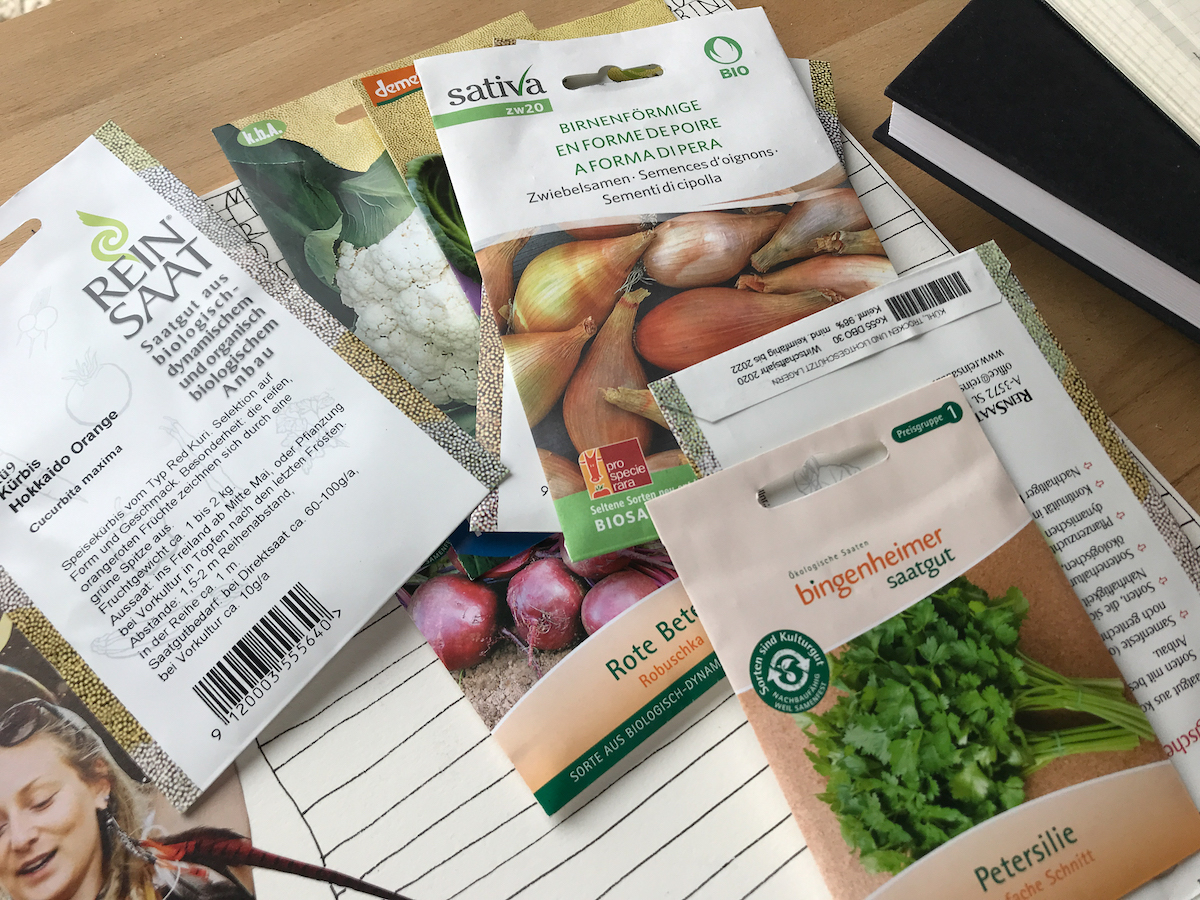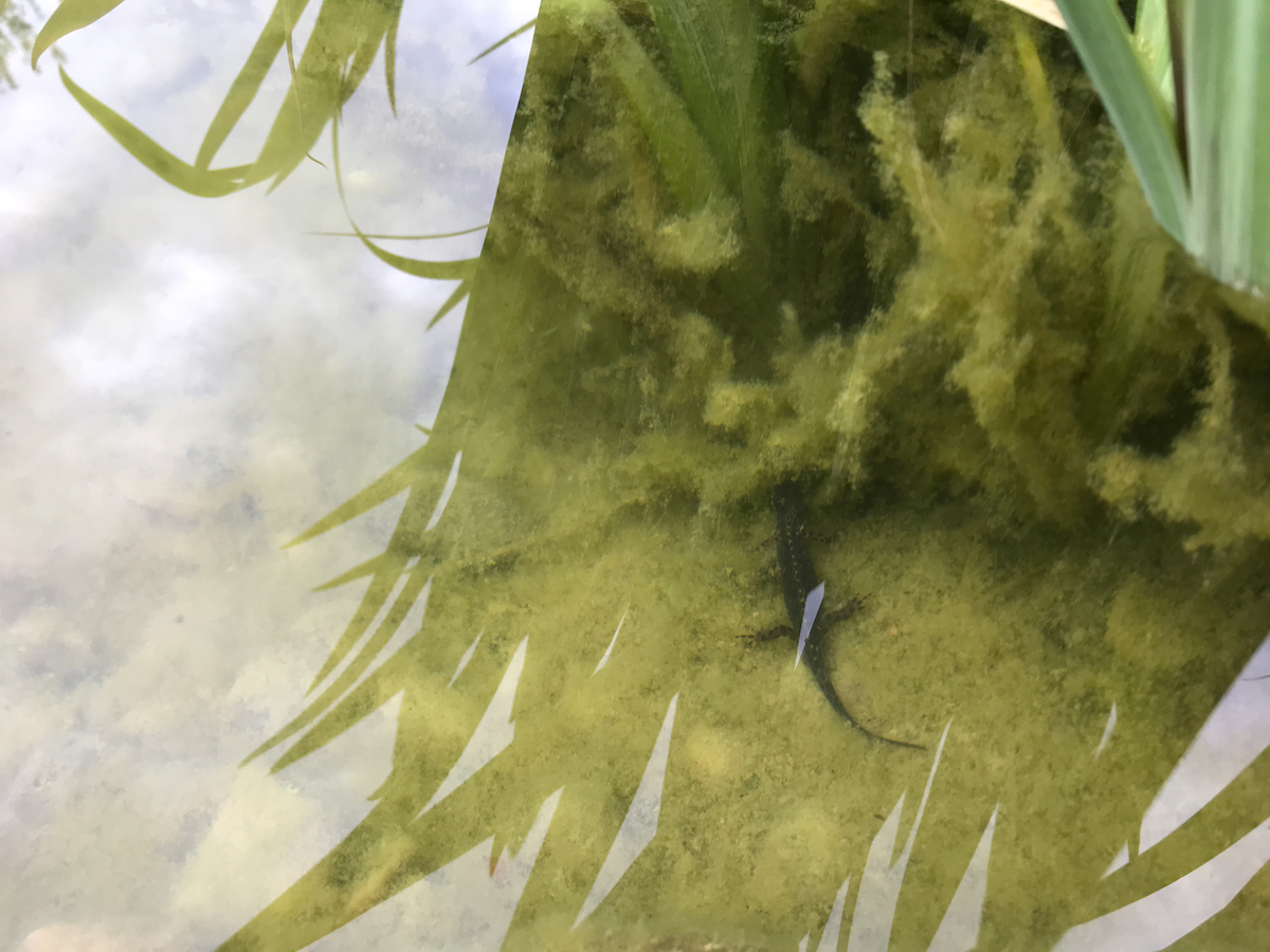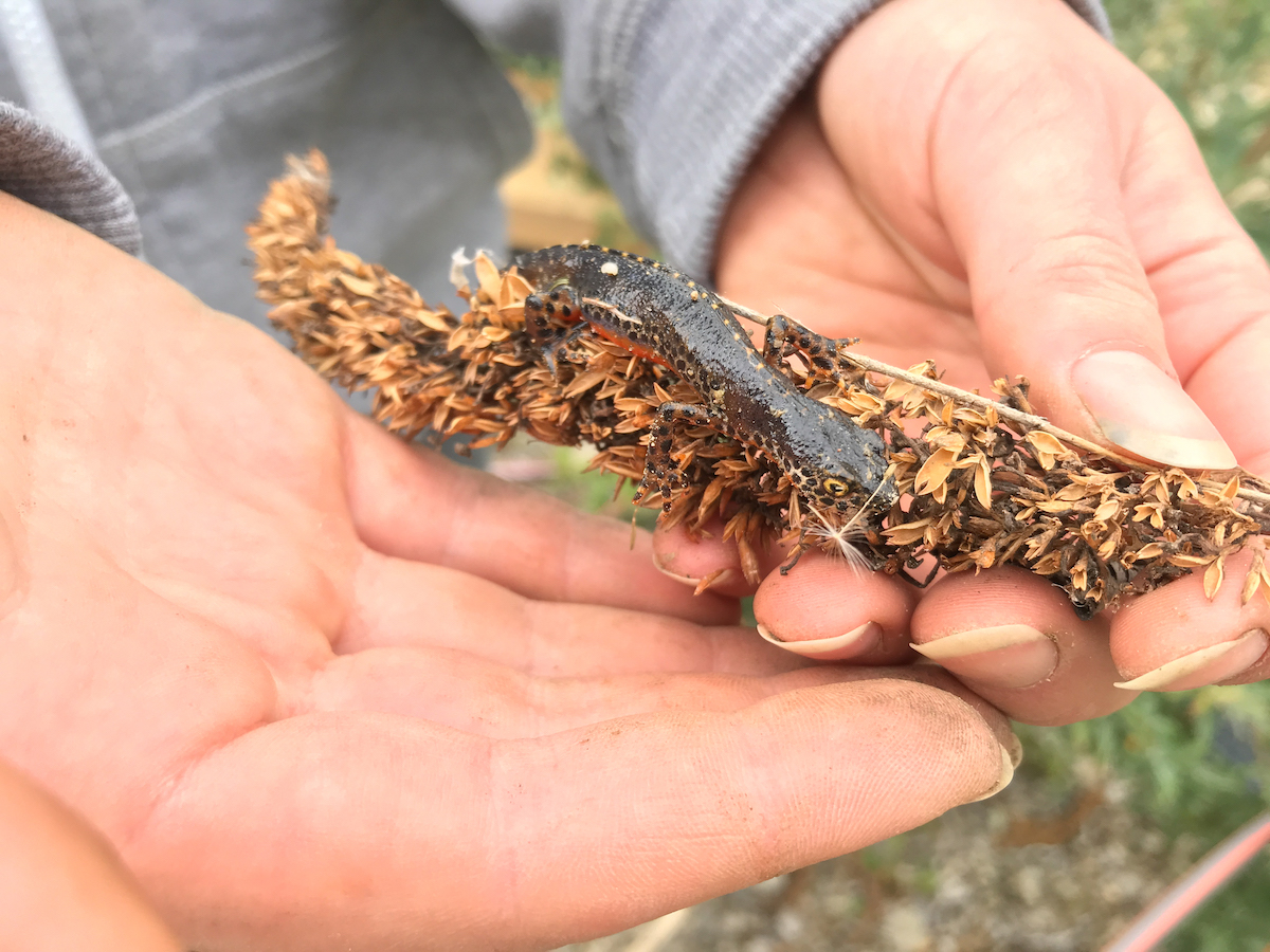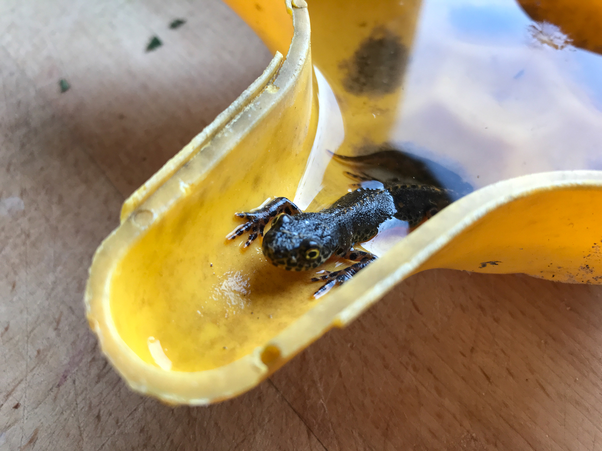 Zu Hause haben wir dann bisschen im Garten gewerkelt. Die Post hat meine letzte Saatgutbestellung gebracht. Juhu! Nach dem Regen ist die Erde herrlich feucht. So habe ich Weisskohl, Rosenkohl, Blumenkohl, Petersilie, Rote Beete und Zwiebeln ausgesät. Bei unserem Gewerkel hat der Sterngucker ein Tierchen an unserer Steinmauer entdeckt: “Mamaaa, eine Eidechse!” Juhu, ich hatte so gehofft, dass sich Eidechsen in unserer Mauer ansiedeln. Die Tochter schaute sich gleich das Tier an: “Das ist keine Eidechse, das ist ein Molch. Und er sieht ziemlich trocken aus. Er braucht Wasser.” Also haben wir den Molch in eine Sandform mit Wasser getan. Da ging es ihm gleich viel besser. Hm, wo kommt ein Molch her? Uns fiel kein Teich in der Nähe ein. Wo können wir ihn aussetzen? Wir haben ihn letztendlich beim Anhänger zurückfahren mitgenommen in den Teich des Tochterfreundgartens.