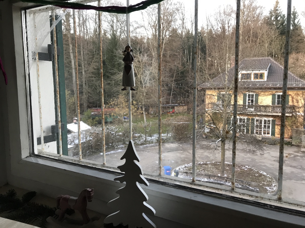 Der Dezember verwöhnt uns in den letzten Tagen mit strahlendem Sonnenschein und frostigen -3 Grad. Es gibt schöne Morgen und Abendhimmel, Eisblumen am Fenster, weisser Atem beim Rausgehen und Nebelschwaden durch die Waldgebiete. Ich mag das sehr.Im drinnen haben wir noch gar nicht richtig viel geschmückt, aber es ist trotzdem schon weihnachtlich. Die Kinder haben einen Adventskalender mit Bildertürchen: der Wolf eine winterliche Szene in einem Retrofernseher, die Tochter kitschige handbeglitterte Glitzerkätzchen, der Sterngucker den Anderer Advent Kinderkalender (ich hab die Erwachsenen-Version und eine Adventskalender-Karte von einer lieben Blogleserin). Im Wohnzimmer steht der Korb mit den Weihnachtsbüchern, wo der Sterngucker immer mal wieder eins rausnimmt und drin schmökert. An den Fenstern hängen ein paar Transparentsterne. Mehr gibt es noch nicht. Aber vielleicht bleibt es auch so. Ok. Der Sterngucker will die Pyramide haben. Vielleicht wird es doch noch üppiger.