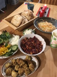Am Nachmittag war ich beim Boesner, um Rahmen und Passepartouts für eine Auftragsarbeit zu kaufen. Danach habe ich noch Fladenbrote beim Türken besorgt. Die gab es zum Abendessen mit Krautsalat, Falafel und anderer leckerer Füllung. Das war mal was anderes und kam bei allen gut an.