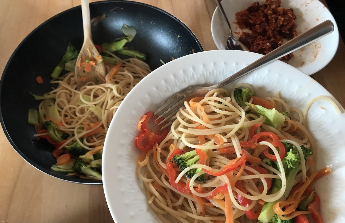 Zum Mittag gab es veganes Chili (für den Wolf. Der futtert so eine Portion in zwei Tagen alleine weg) und Spaghetti mit Gemüse. Der Sterngucker aß im Kindergarten. Zum Abendessen habe ich Pizzaschnecken und Salat aus Gurke, Kichererbsen und Karottenscheiben gemacht. Das war ganz lecker.