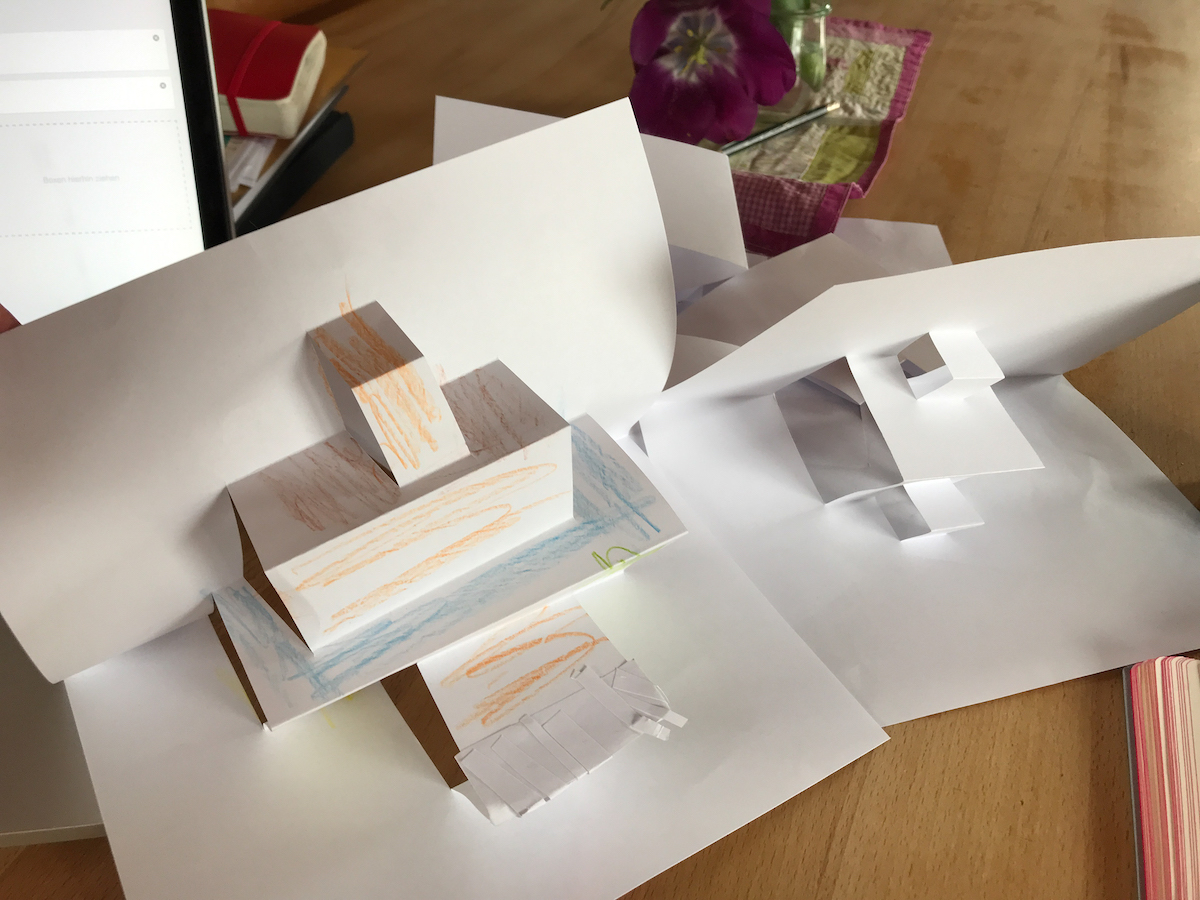 Der Sterngucker hat sich eine Anleitung für eine Pop-Up-Karte angeschaut und nachgebastelt. Das hat er so oft gemacht, bis er sie auswendig konnte. Nach dem Mittagessen (es gab Linsensuppe, die ich schon am Vorabend gekocht habe) hat er uns zum gemeinsamen Pop-Up-Karte basteln eingeladen. Wir sassen also am Tisch und liessen uns von ihm zeigen, wie das geht. Er war so stolz, dass er das jetzt kann. Am Nachmittag hat er gleich mit seinem Bruder als Kameramann ein Tutorial dazu gedreht, was er am Abend mit dem Mann bearbeitet hat, weil er wissen wollte, wie das geht. Am Ende das Tages war er so voller freudiger Spannung über seinen Erfolg und sein Erleben, das war herrlich anzusehen.