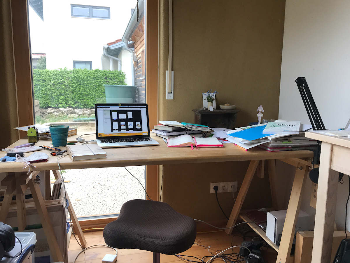 Ich habe eigentlich am Morgen meine beste Arbeitszeit, momentan merke ich aber, wie es sich durch die Anwesenheit der Kinder verschiebt. Der Mann und ich, wir arbeiten ja beide zu Hause und versuchen unsere Aufgaben in den Tag zu verteilen. So hab ich gestern am Vormittag nichts weiter geschafft, dafür aber ein schönes Telefonat mit einer Kollegin geführt. Am Nachmittag konnte ich mich dann aber zurückziehen und richtig was rocken. Ich schiebe shcon eine Weile den Text für einen Artikel vor mir her. Ich bewege die Inhalte im Kopf, mache mir Notizen und Stichpunkte. Gestern habe ich in einem Rutsch ganze 700 Worte für den Artikel schreiben können. Ich werde bescheiden mit meinen Anforderungen an mich. Die Konzentration ist einfach nicht die gleiche, wenn ich immerzu von den Kindern unterbrochen und angesprochen werde. Auf meinem Schreibtisch sieht es aus wie in meinem Kopf: lauter angefangene Projekte und gedanken, unfertige Aufgaben und Ideen. Wah! Ich musste gestern vor Beginn meiner Arbeit erstmal den ganzen Schreibtisch leerräumen.