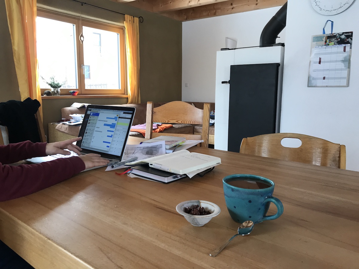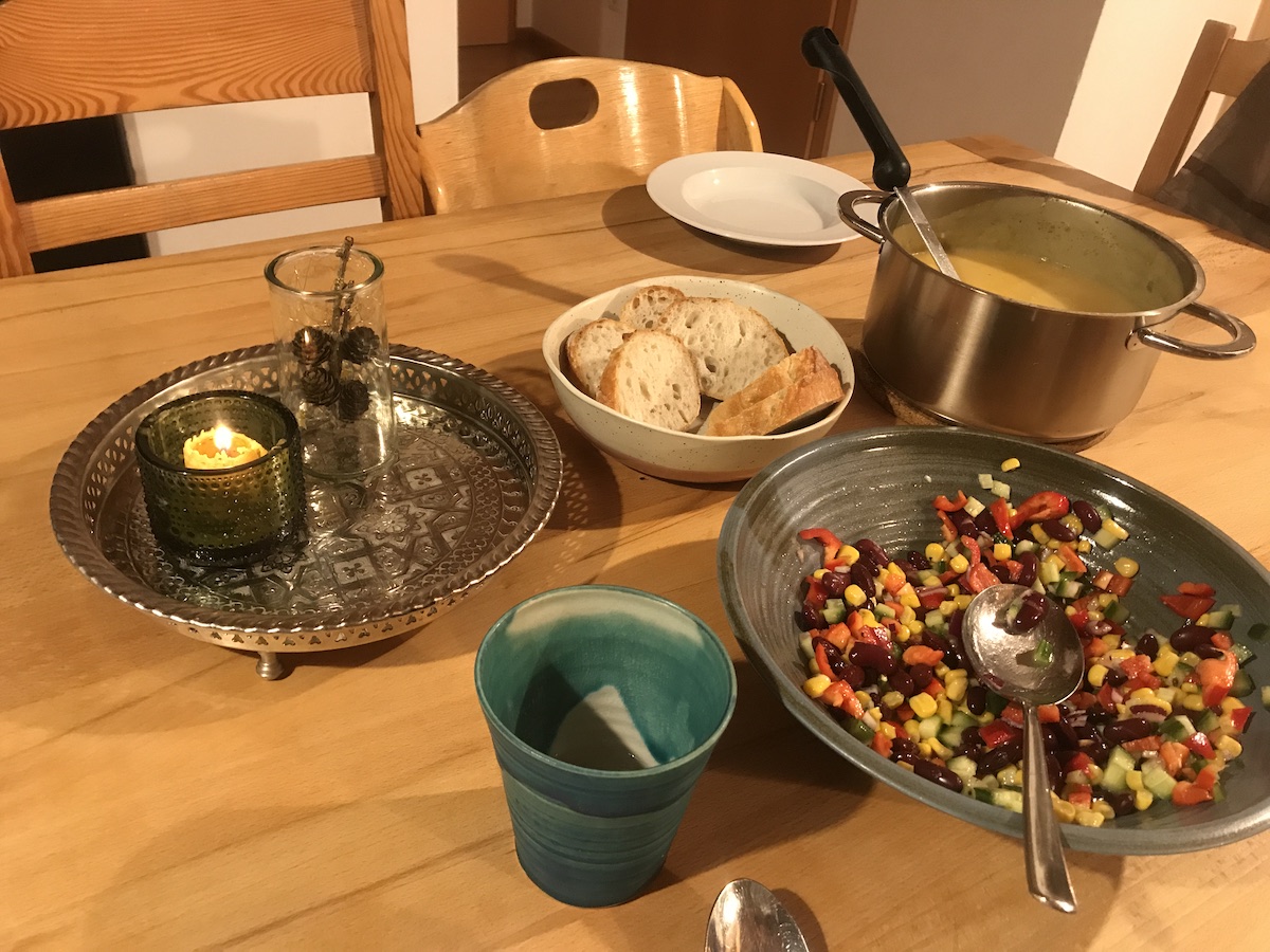 Zum Mittag esse ich Nudeln und Salat. Am Abend gibt es Kartoffelsuppe (und nochmal den Mais-Bohnen-Salat). Das Essen bereite ich schonmal vor, bevor ich den Sterngucker gegen 17 Uhr abhole. Er wird müde sein vom Rodeln und Spielen. So war es die letzten Tage immer.