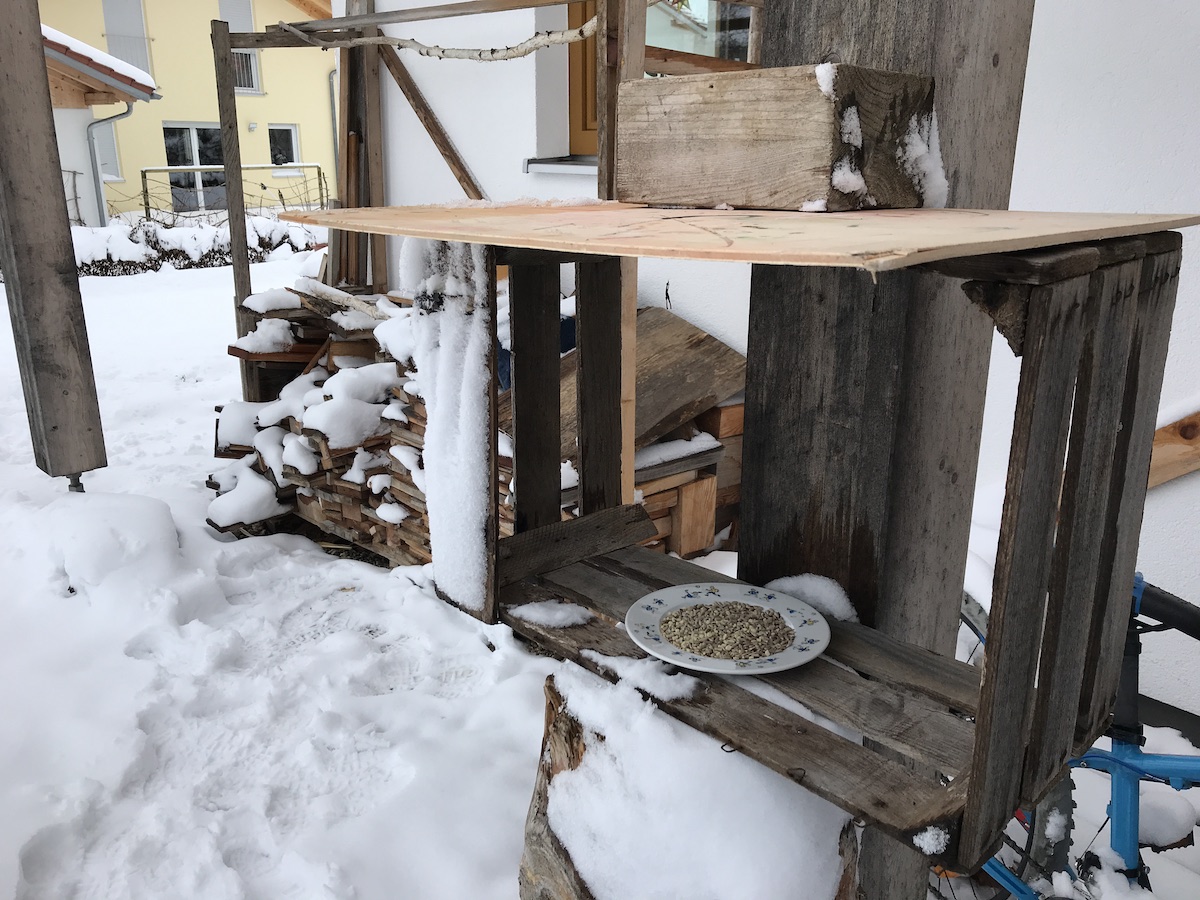Schon lange wünsche ich mir ein Futterhäuschen für die Vögel. Jetzt, wo die Schneedecke so dicht geschlossen ist noch dringender als sonst. Sie finden ja auf unserem Kompost ein kleines Schlaraffenland. Aber nun ist alles schneebedeckt. Aus einer alten Kiste baue ich ein kleine Notfutterstation und stelle einen Teller mit Körnern hinein. Jetzt hoffe ich, dass sie das irgendwie entdecken. Das frag ich mich ja eh, woher sie das plötzlich wissen sollen, dass es da jetzt Futter gibt. Riechen die das? Nee, oder?