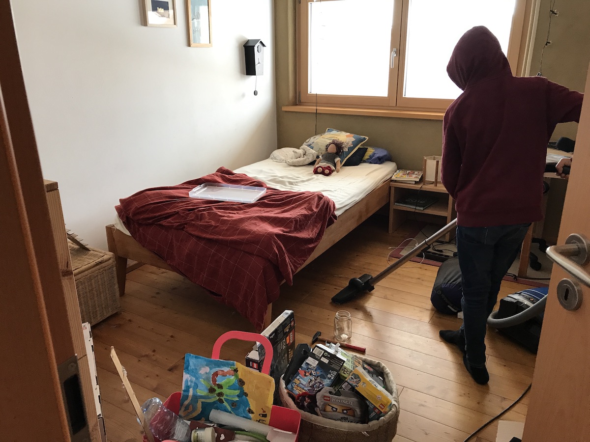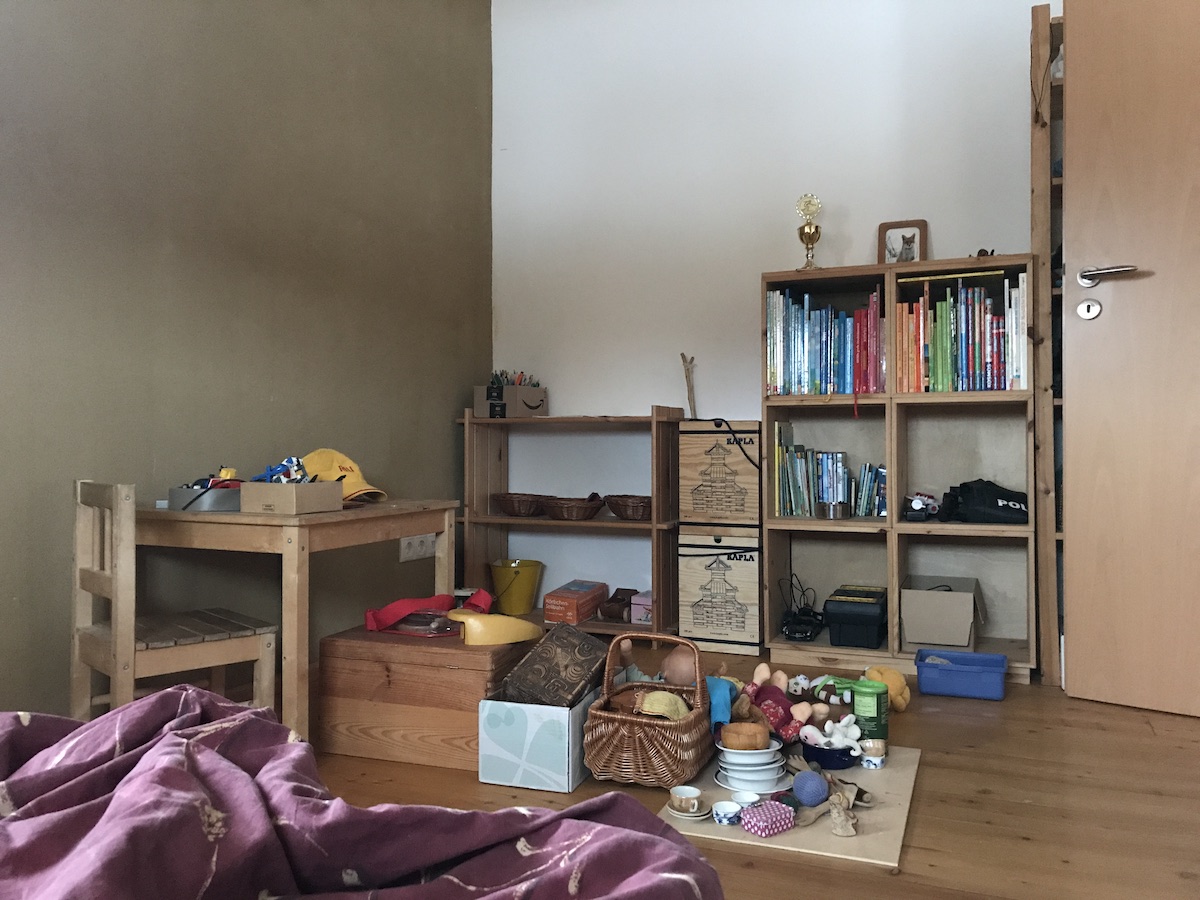 Dann pflege ich die Badwand, hänge Wäsche auf und setze mich dann mit dem Wolf zusammen, um mit ihm über das Minecraftthema zu sprechen. Wir notieren, was uns beiden wichtig ist und wie wir gemeinsam eine gut funktionierende Lösung finden können. Weil wir alleine daheim sind, nutzen wir die Zeit und räumen sein Zimmer auf. Er trennt sich von vielen Sachen, auch seinem Lego und ist ganz glücklich über das nun sehr leere und klare Zimmer. Wir finden, dass neben dem Regal jetzt ein Sessel cool wäre.
