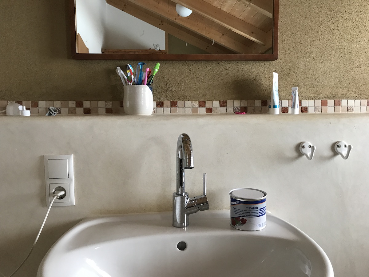 Die verbleibenden 20 min nutze ich, um schnell noch Flur und Treppe zu saugen und das Bad wenigstens grob zu putzen. Dabei fällt mir auf, dass der Tadelakt mal wieder eine Behandlung braucht. Ich stelle mir die Dose als Erinnerung hin und bringe dann den Sterngucker zu seinem Freund. Währenddessen steht auch der Wolf auf.