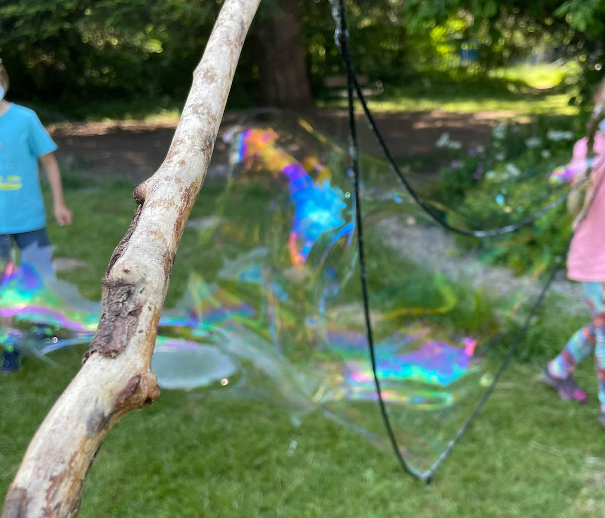 Am Donnerstag hatte ich Freude. Da war mein erster Nachmittagskurs seit dem Lockdown. Ich hatte schon gegrübelt, was ich mit den Kindern machen könnte. Ich wollte gern mit ihnen draussen sein, weil wir da ohne Maske sein können. Meine Mutter hatte die Idee, dass ich bei dem Wetter doch mit ihnen Seifenblasen machen könnte. Ha! Perfekt. Also kaufte ich vor dem Kurs noch schnell die Zutaten für die Seifenblasenmischung, packte Schnur und einen Eimer ein. Dann haben wir im Schulwald passende Stöcker gesucht und mit der Schnur die Schlaufen für die Seifenblasen geknotet. Die Kinder waren den ganzen Nachmittag damit beschäftigt und hatten echt Spaß daran. Ich auch!