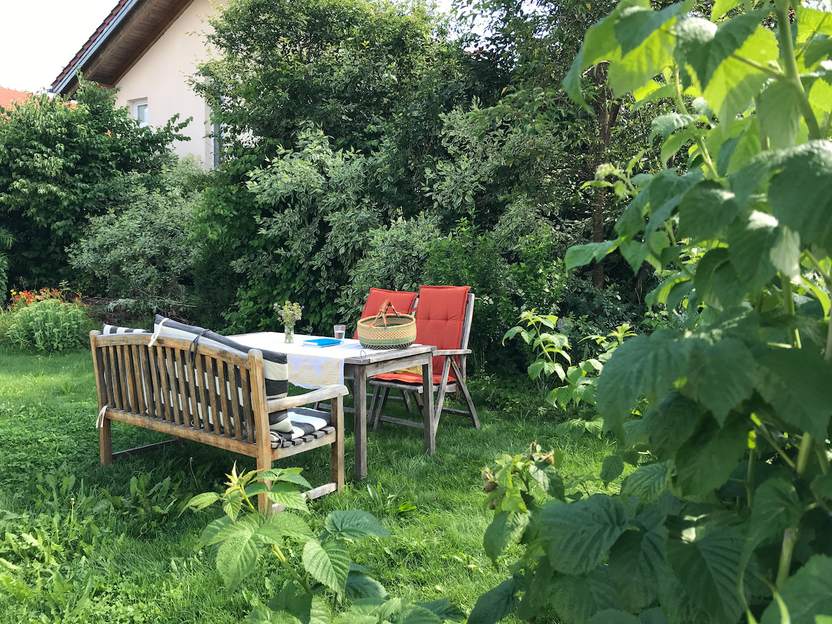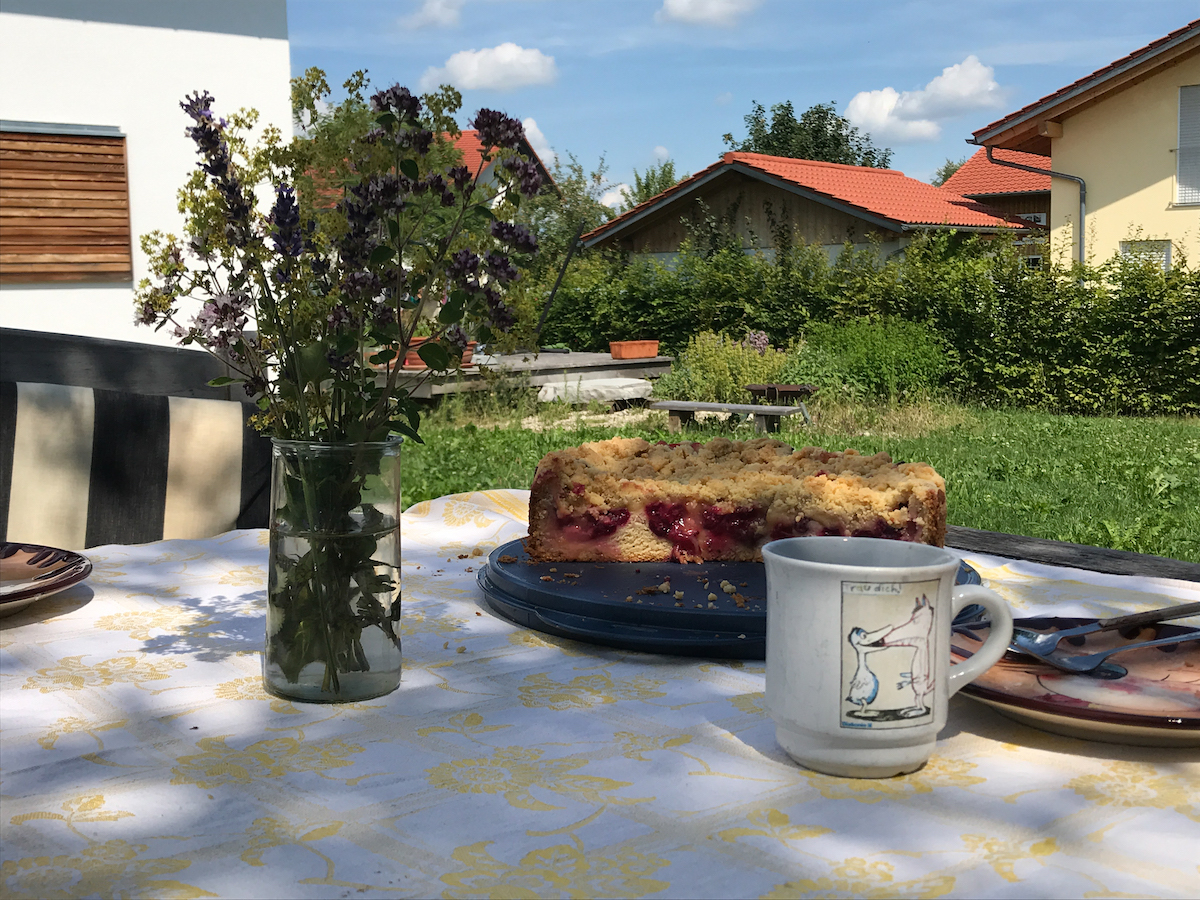 Am Wochenende hatte ich die Idee, unseren Tisch und die Bank von der Terrasse in den Garten zu stellen. Dort gibt es früher am Nachmittag schon Schatten. Uns allen gefällt der neue Tischplatz und Perspektivwechsel sehr. Wir schauen auf unser Haus, sind umgeben von Grün und sitzen im Schatten. Überhaupt ist es im Garten schön. Am coolsten finde ich gerade immer noch, vorm Mittagessen rauszugehen, kurz zu graben und mit einer Schüssel voller Kartoffeln in die Küche zu gehen und sie zum Essen zuzubereiten. Das hat was.