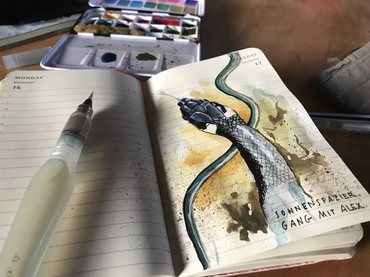 Beim Fotos machen habe ich eine Ringelnatter entdeckt, die durch mein Näherkommen aufgeschreckt wurde und schnell in ein Loch zurück schlängelte. Wieder daheim gab es Tee und Plätzchen. Ich habe die Ringelnatterbegegnung gleich in meinem Moleskine festgehalten. Aus Spaß habe ich noch bisschen über die Bedeutung und Symbolik von Schlangen gelesen. Das passte thematisch wunderbar zu meinem Coaching heute. Interessant. Wir spielten noch eine Runde Autokarten mit dem Wolf. Der Sterngucker war heute bis Nachmittag in der Schule.