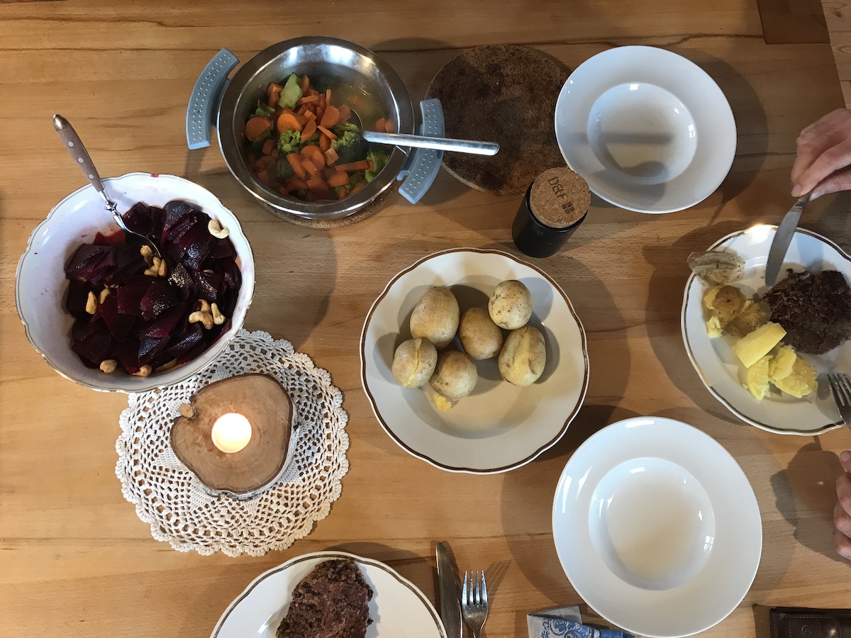 Wieder daheim bin ich erstmal durchgefroren. Für den Nachmittag brauche ich eine Schicht mehr. Brr. Mit dem Mann bereite ich das Mittagessen zu. Es gibt Bratlinge aus roten Bohnen, kartoffeln, Gemüse und einen Rote Beete Salat dazu. Ein feiners Massaker entsteht auf dem Schneidebrett. Das Essen nährt und wärmt mich. Dann muss ich schon bald wieder los. Erst Mittagspausenaufsicht, dann Bastelkurs. Heute gestalten wir Kerzen. Dazu habe ich rote Stumpenkerzen gekauft, die wir mit Wachsplatten bekleben. Dabei hören wir ein Hörbuch und haben es gemütlich.